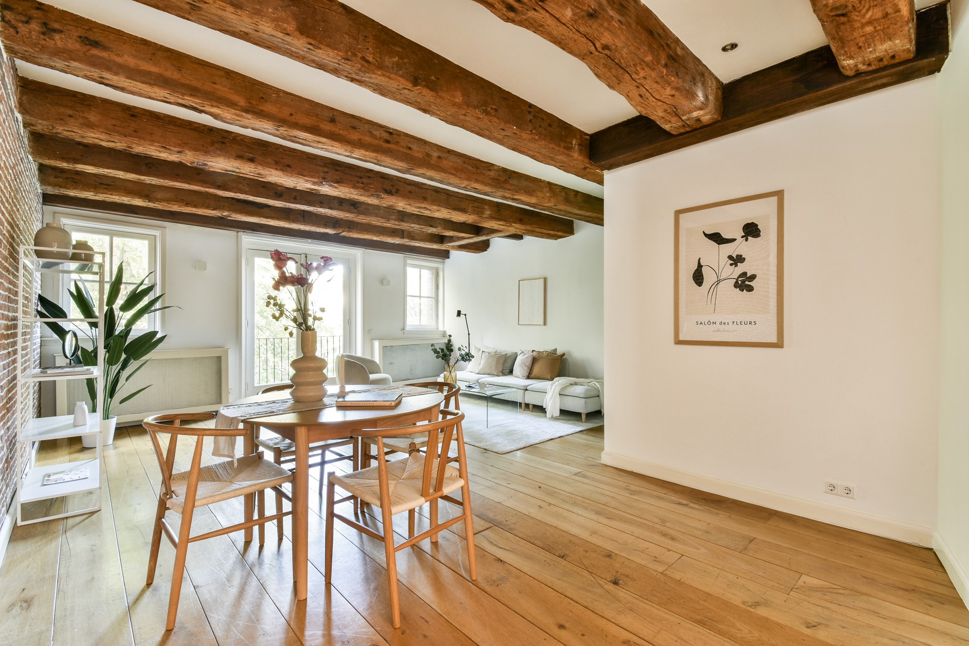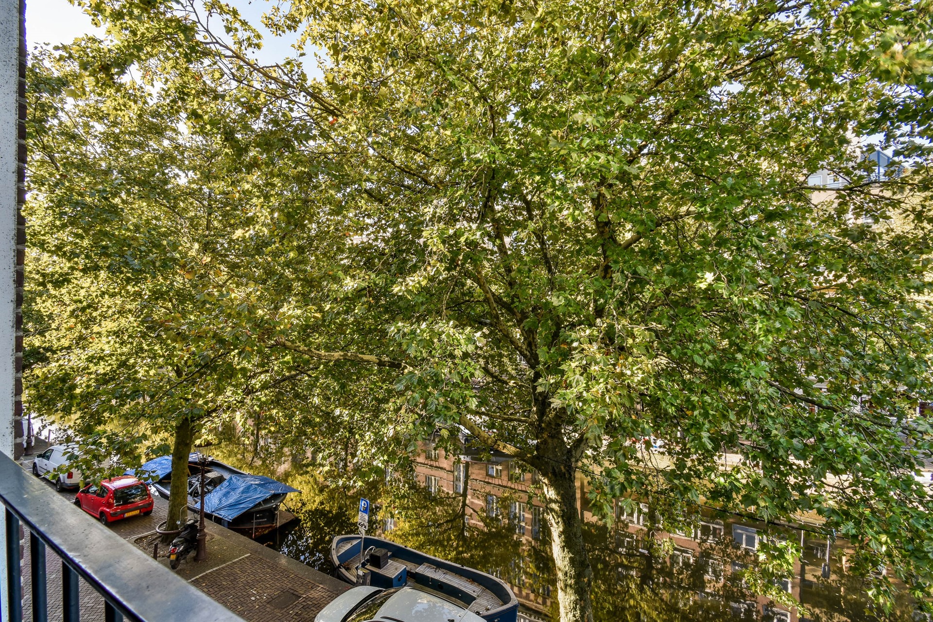 At the front is the spacious living area with semi-open kitchen, fitted with various built-in appliances. Thanks to the French doors with a French balcony overlooking the canal, the living room enjoys a bright, open atmosphere. The high wooden beams add extra character and warmth. From the French balcony, you have a stunning view of the canal, while the trees in front provide plenty of privacy.