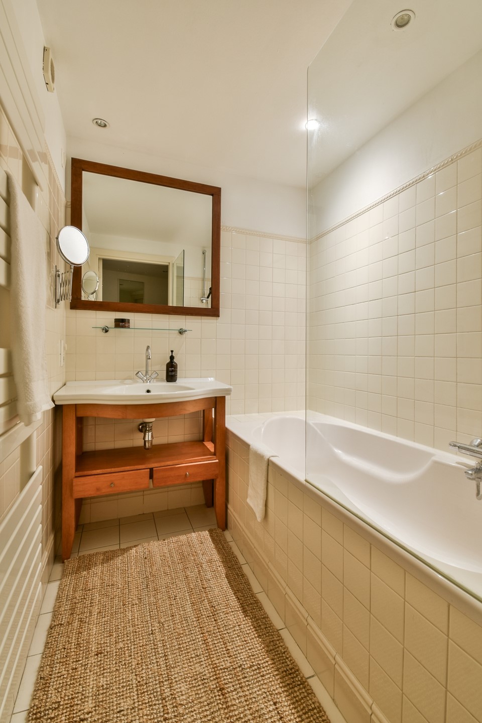 At the rear are two well-sized bedrooms, quietly located and fitted with double-glazed windows. The bathroom, accessible from the hallway, features a bathtub with shower, a modern vanity unit, and a heated towel rack.