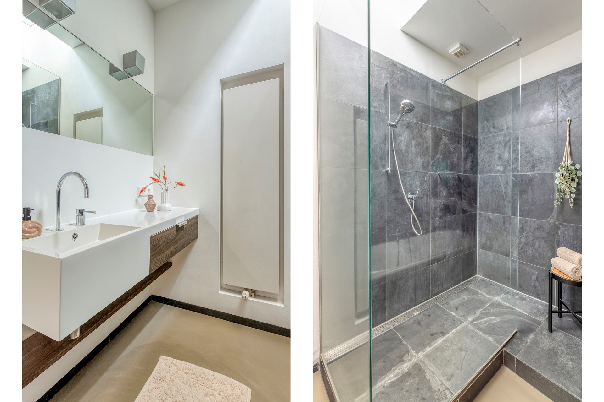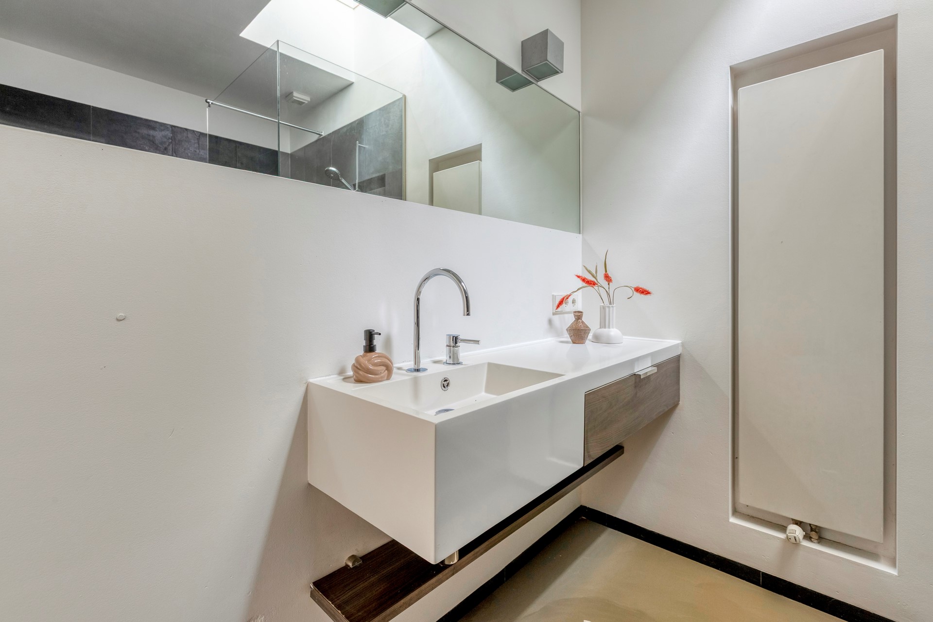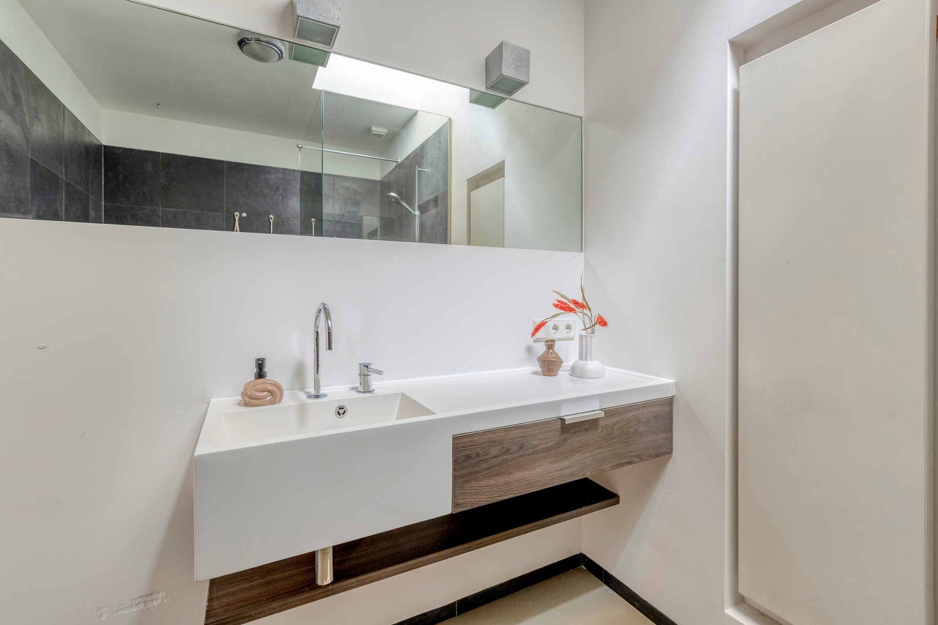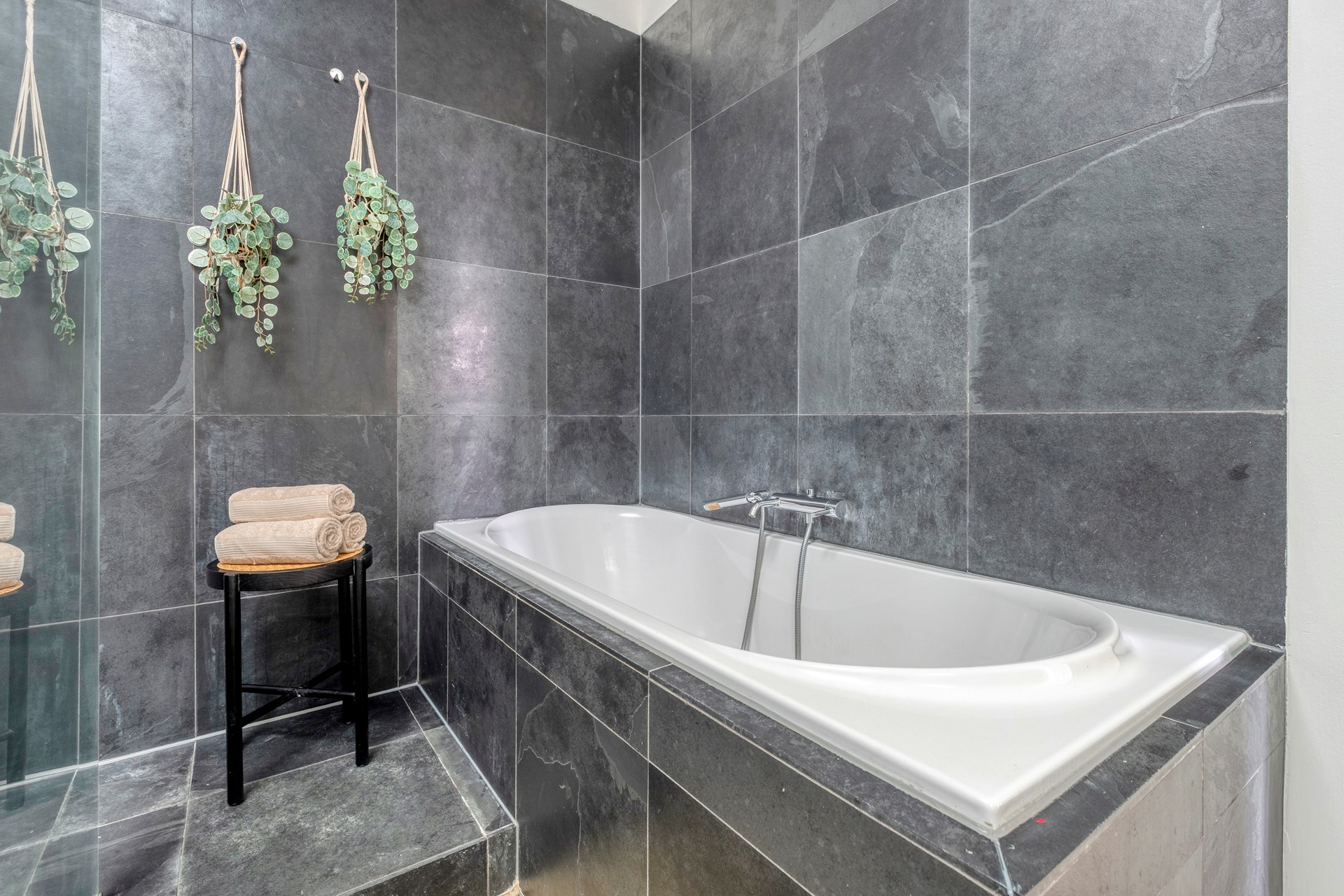 De luxe badkamer is centraal gelegen en beschikt over een ruime inloopdouche, een ligbad en een modern wastafelmeubel. Aan de rustige achterzijde liggen nog twee slaapkamers, waarvan één voorzien van een inloopkast.