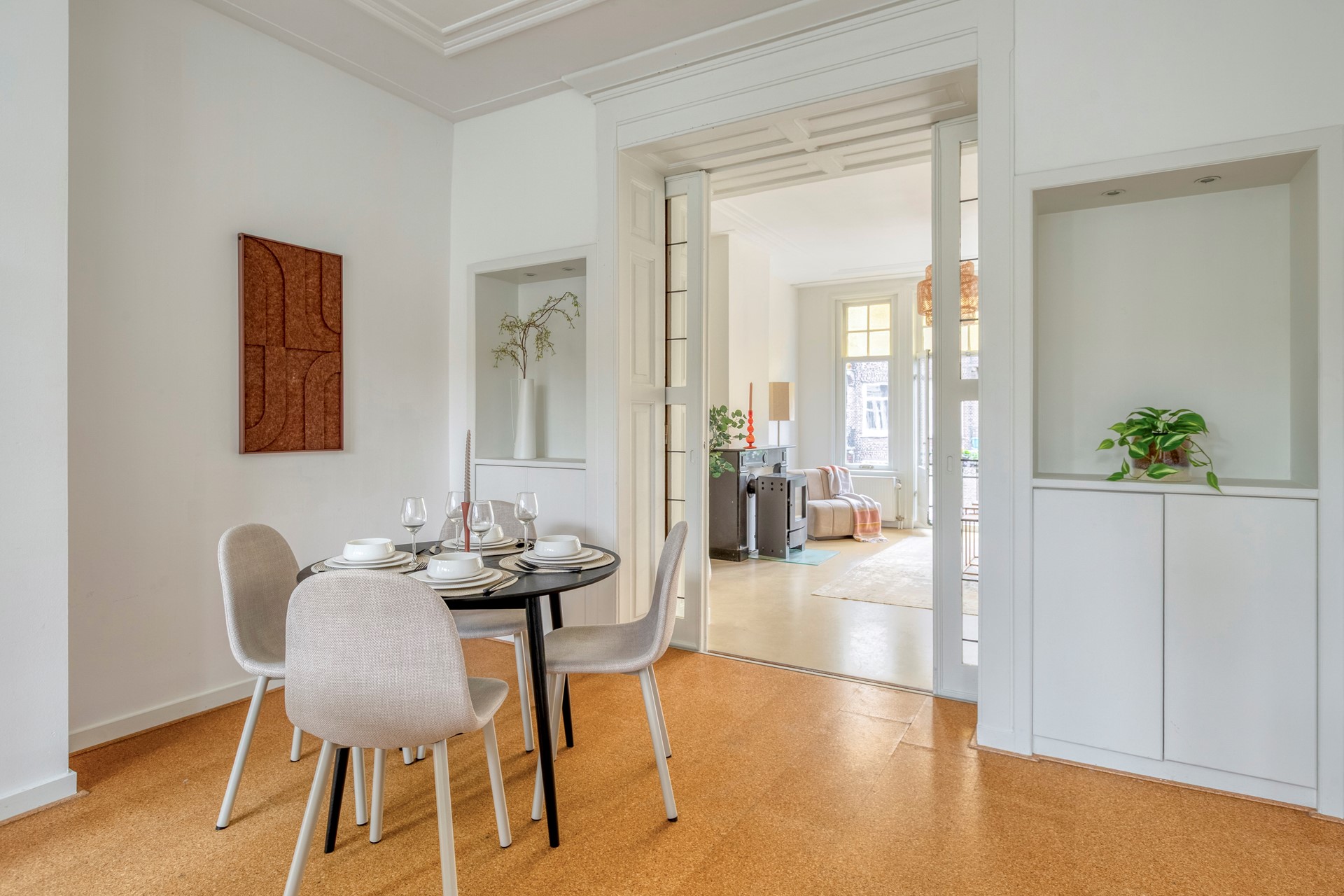 Dit royale appartement van circa 182 m² is verdeeld over de tweede, derde en vierde verdieping, met een eigen opgang vanaf de straat.