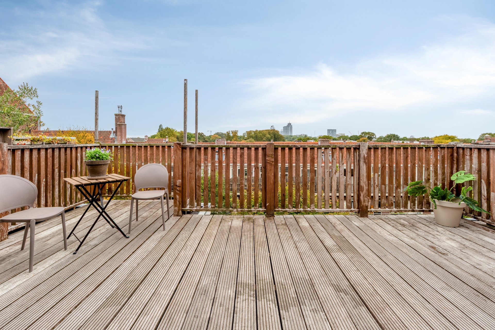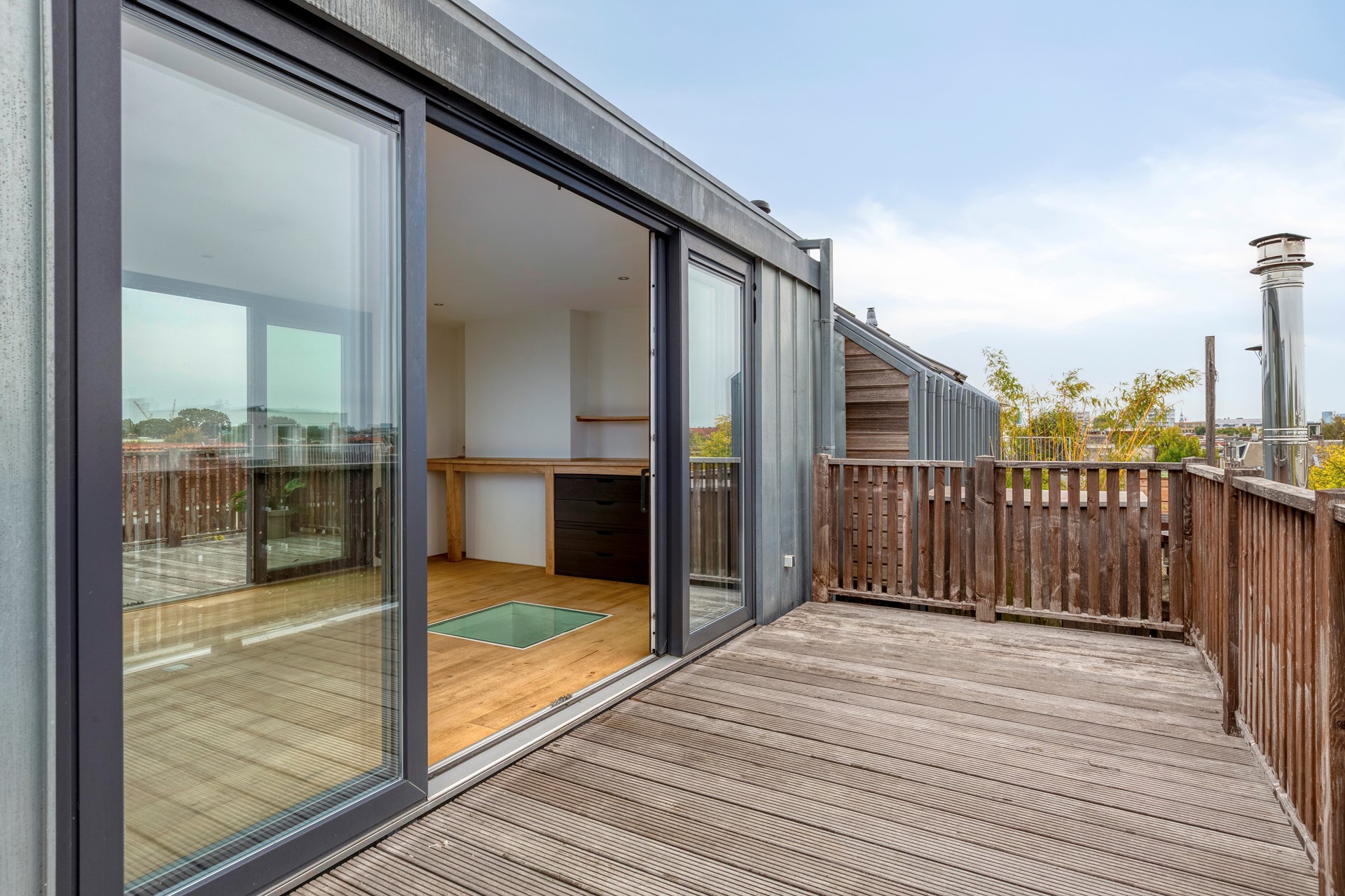 A beautiful bright “through-room” with a small pantry with a water connection and fitted with oak wood flooring. With sliding doors on both sides, you have access to TWO rooftop terraces, both finished with luxury Bankirai decking. Wonderful spots to enjoy the sun!