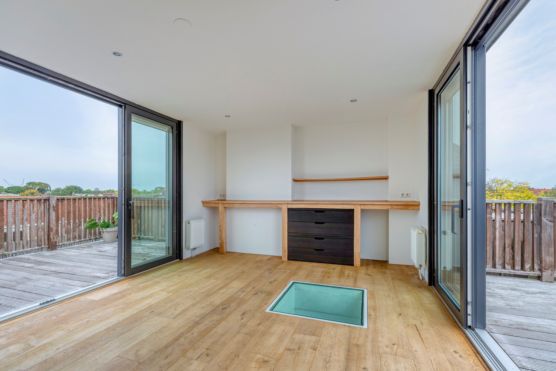 Een prachtige lichte doorzonkamer met een kleine pantry voorzien van wateraansluiting. Via schuifpuien aan beide zijden heeft u toegang tot de twee dakterrassen, beide voorzien van Bankirai-vloerdelen. Een heerlijke plek om te genieten van de zon! Op deze verdieping ligt een eikenhouten vloer.