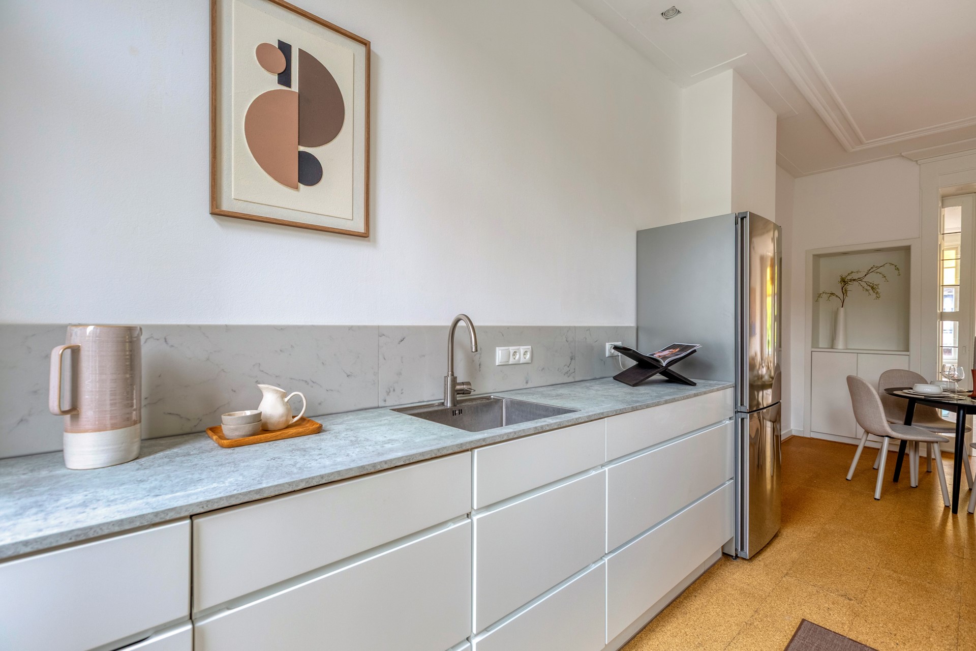 Door het gehele appartement ligt een geïsoleerde gietvloer. Dankzij de doorbraak naar de keuken is er een heerlijke eetgelegenheid gecreëerd.
