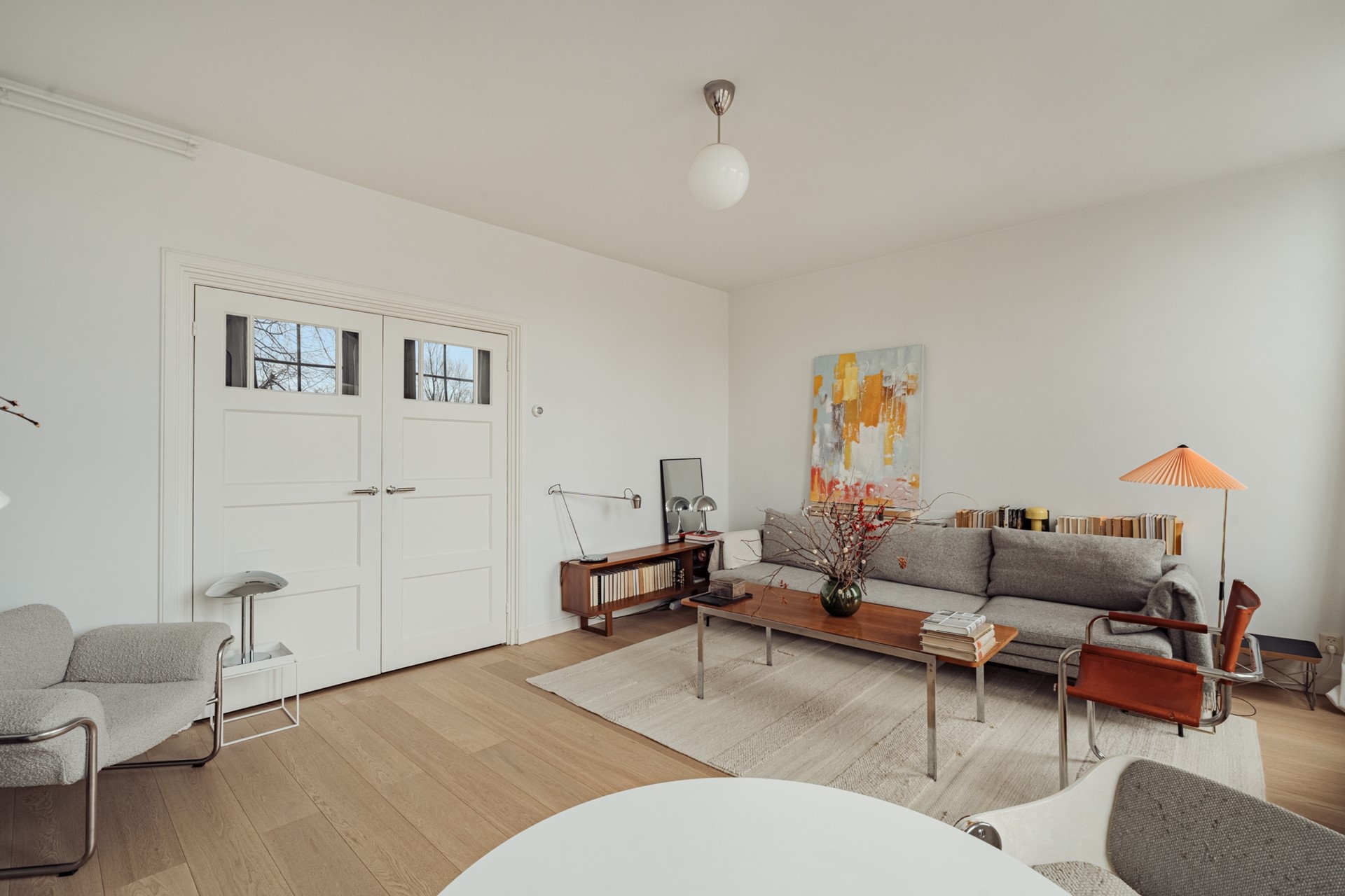 At the front of the apartment is the living room, featuring generous ceiling height, authentic window mullions with double glazing, and an abundance of natural light. The living room overlooks the peaceful canal and enjoys beautiful views of the Hermitage and its gardens.