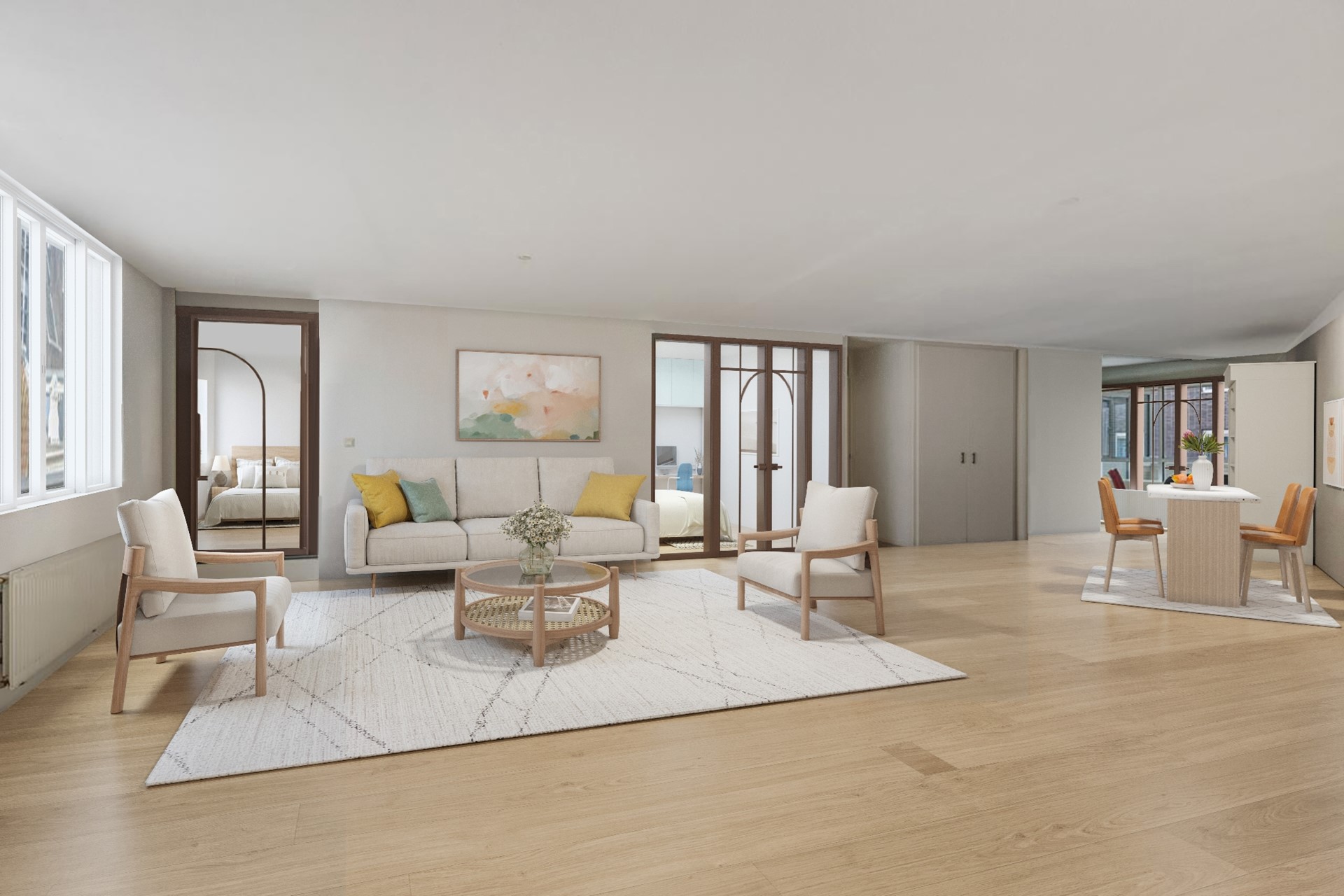On both sides of the hallway, you enter the impressive living room of approximately 65 m². Its playful shape and large windows create a bright and spacious living environment, where multiple seating and dining areas can easily be arranged.