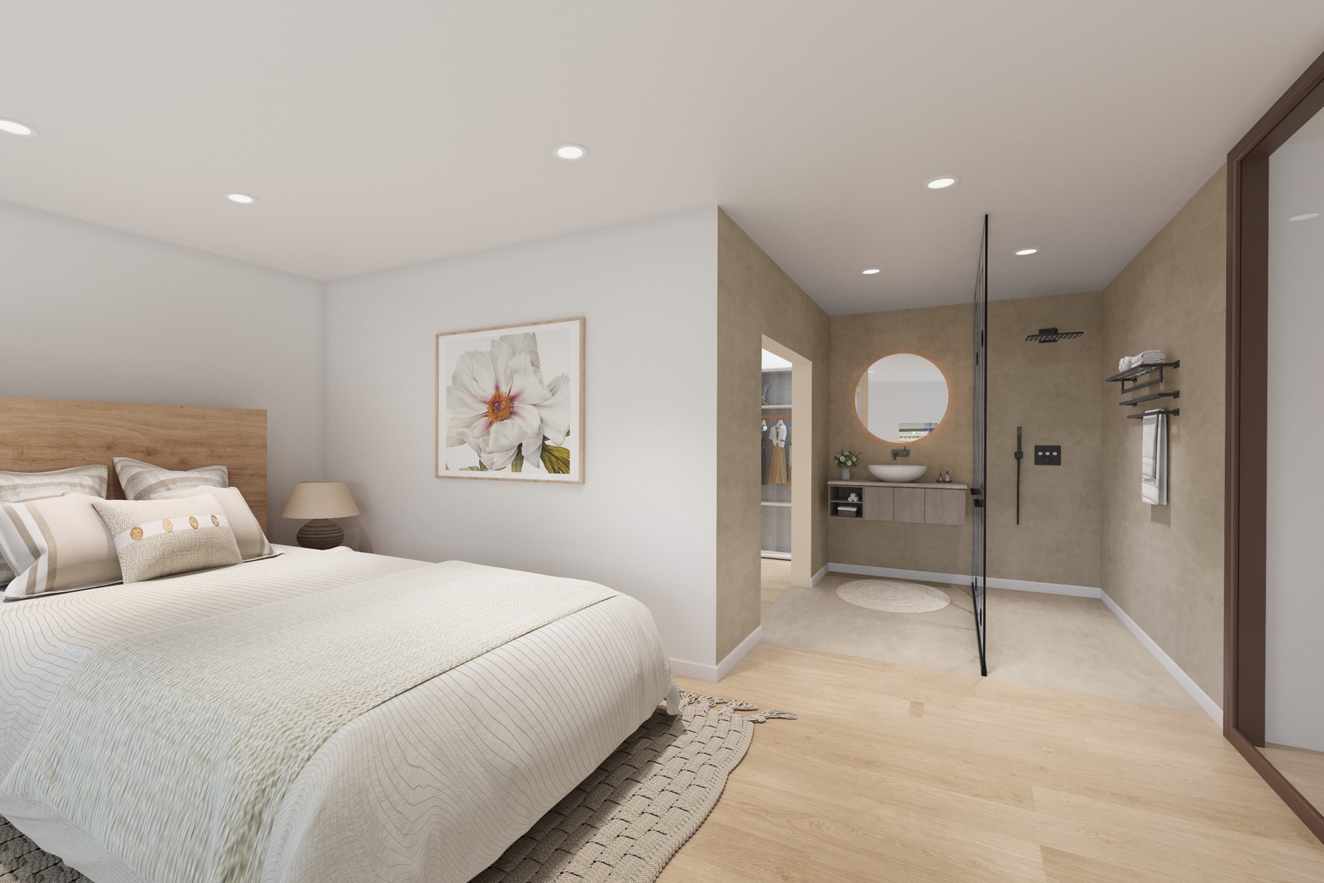 The bathroom is also upgraded: the original bathroom is significantly enlarged and fitted with a bathtub, walk-in shower, vanity unit, a second toilet, and a practical laundry area.