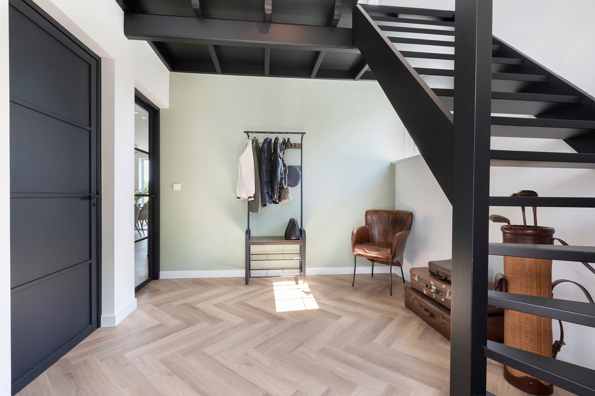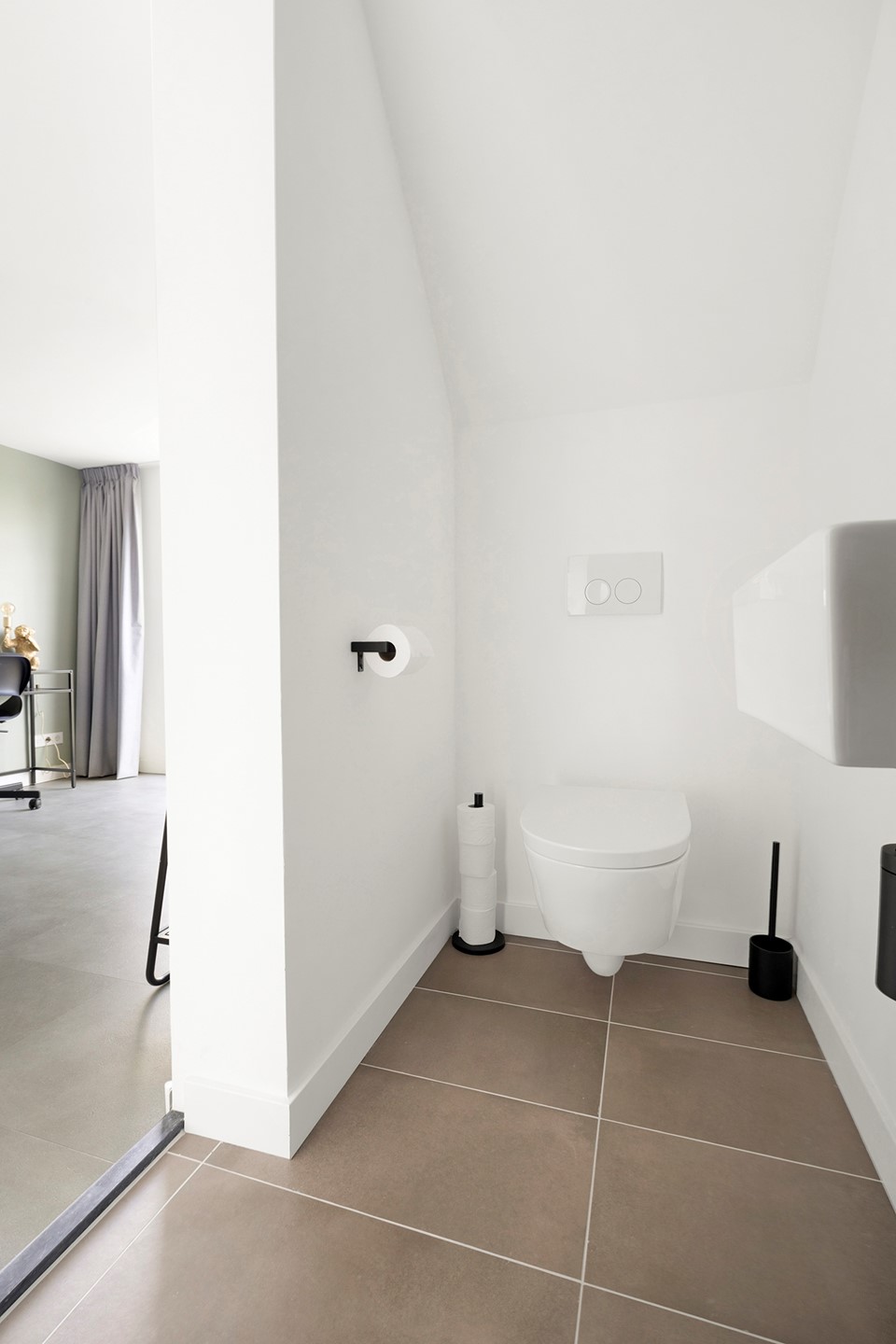 The entrance leads into a spacious hallway with a separate toilet. At the rear, you will find the generous living room with French doors opening onto the terrace, from where you can enjoy stunning views of the water and surrounding nature. The living room features a stylish herringbone floor. The luxurious open kitchen is equipped with a cooking island including Bora, an induction hob, oven, dishwasher, and a fridge with freezer. On the side, there is a practice room or additional bedroom with its own shower and toilet, accessible both from the living room and via a private entrance. The indoor storage room offers ample space and is fitted with connections for a washing machine, dryer, and an electric car charging point.