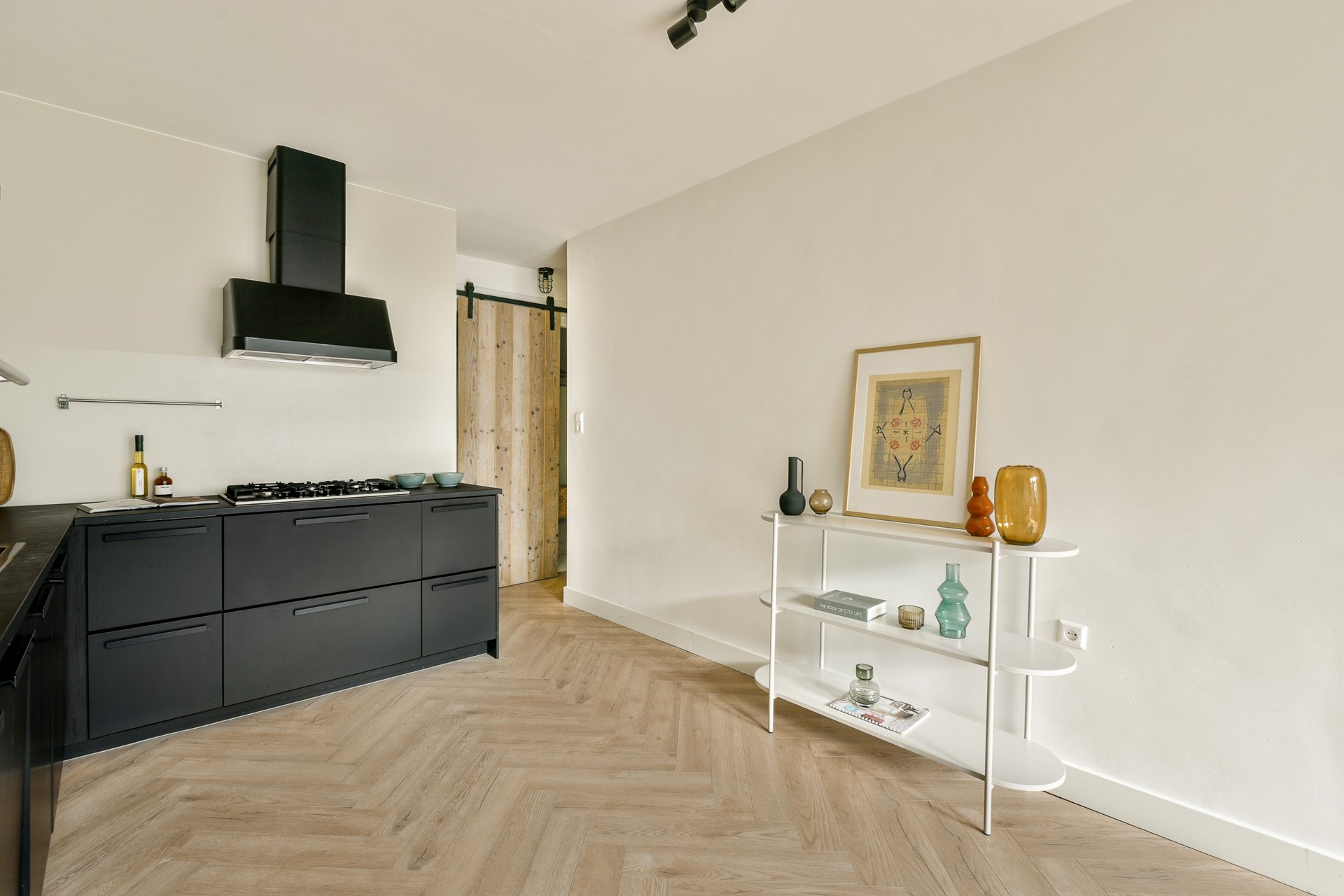 The shared staircase leads to the apartment on the second floor. You enter a spacious hall that provides direct access to almost all rooms. At the front is the spacious and bright living room, characterized by large windows that provide plenty of daylight and a lively view over the Overtoom. Thanks to the ceiling height of approximately 2.65 meters, the space feels extra spacious and there is enough room for both a comfortable sitting area and a dining area.