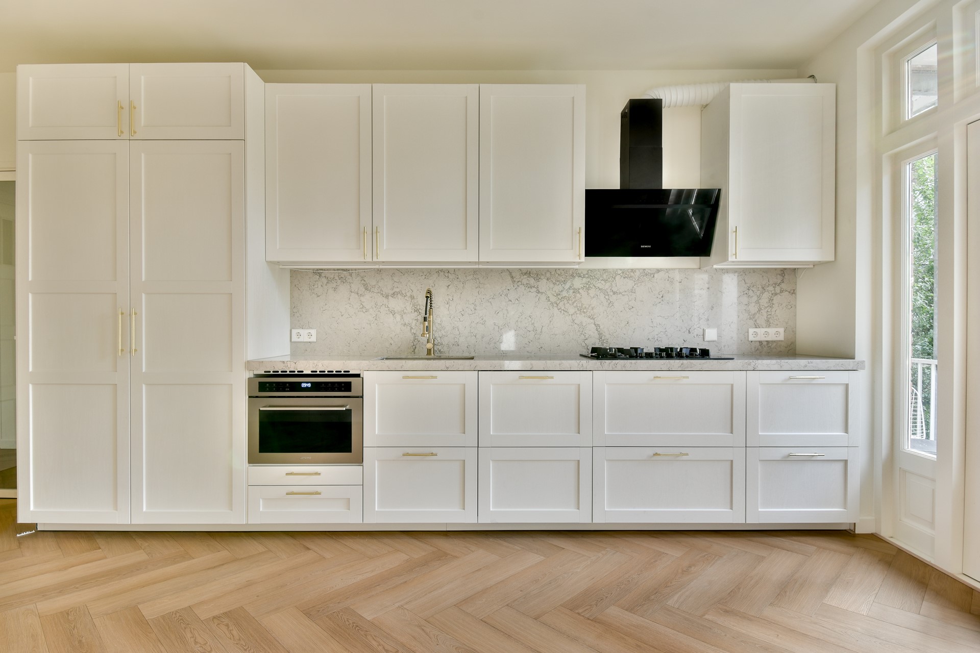This stylish and recently fully renovated apartment is located on the first floor of a charming 1930s building and has been finished to perfection. Upon entering, the high-quality finishes are immediately noticeable: a beautiful herringbone PVC floor with underfloor heating, smooth plastered walls and ceilings, recessed spotlights in all living areas, and water-cooled air conditioning for optimal comfort – summer and winter.