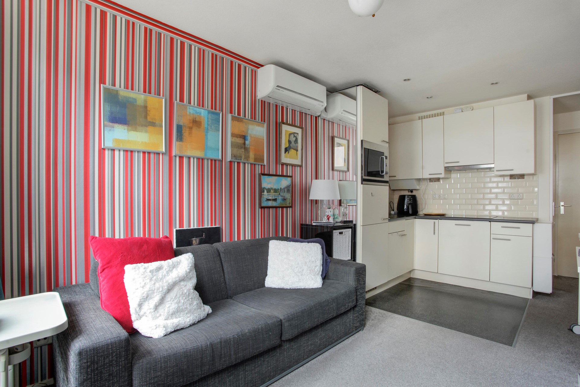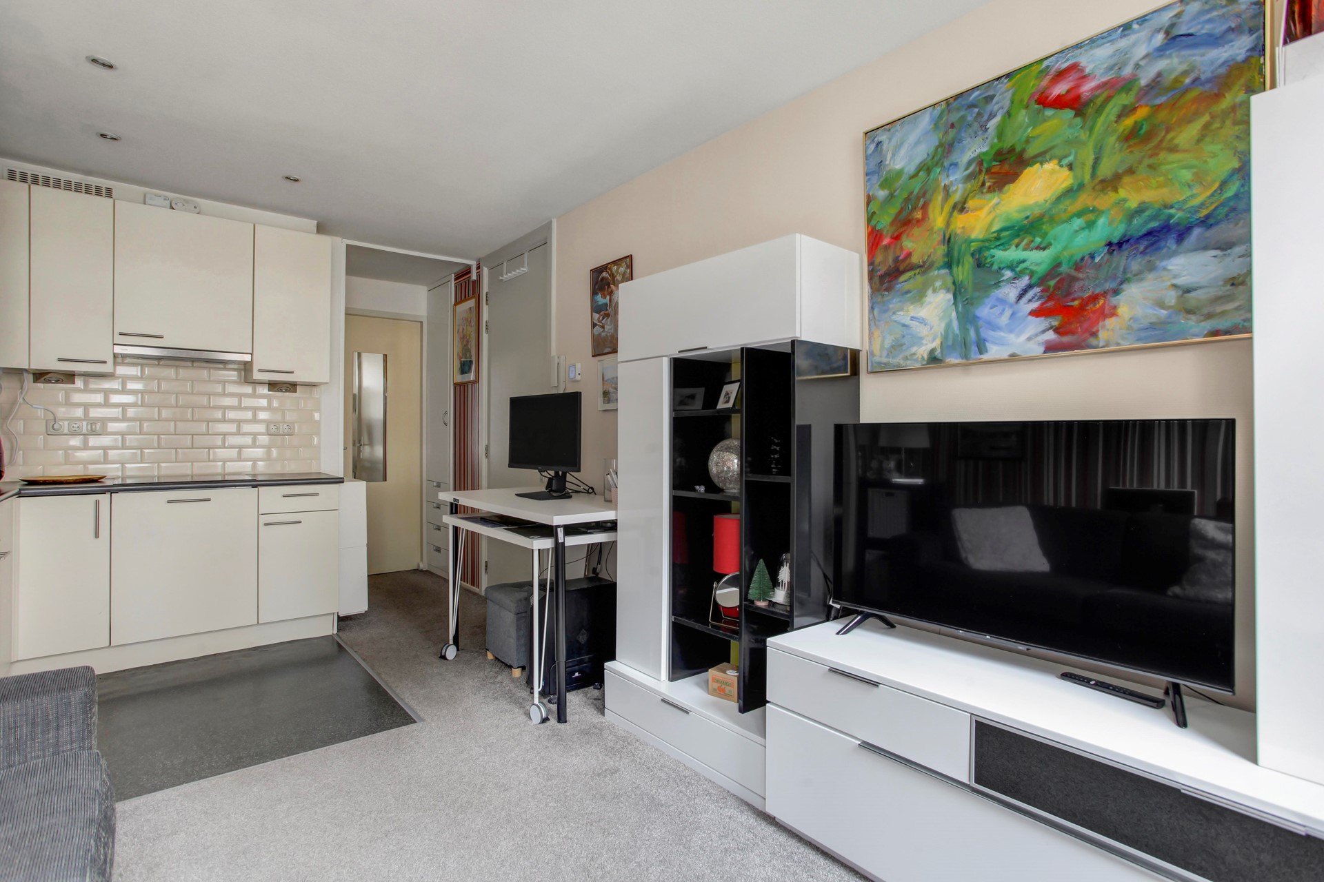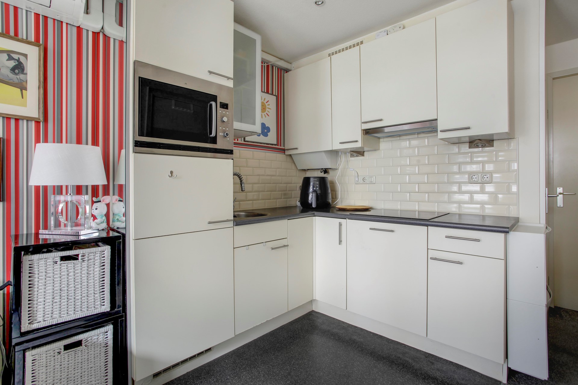 Entrance to the apartment with the living room at the front with the open (corner) kitchen with various built-in appliances, including: fridge with freezer compartment, combi oven / microwave, 4-burner induction hob, extractor hood and dishwasher. The living area is located at the front and is nice and light due to the large windows. The spacious toilet with sink is built in between the living room and bedroom. Spacious bedroom with king size bed and wardrobe. At the back of the apartment is the bathroom with sink with storage cabinet and mirror, a spacious (rain) shower and washing machine (connection).