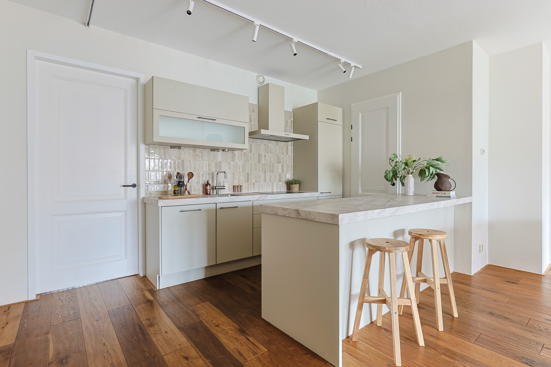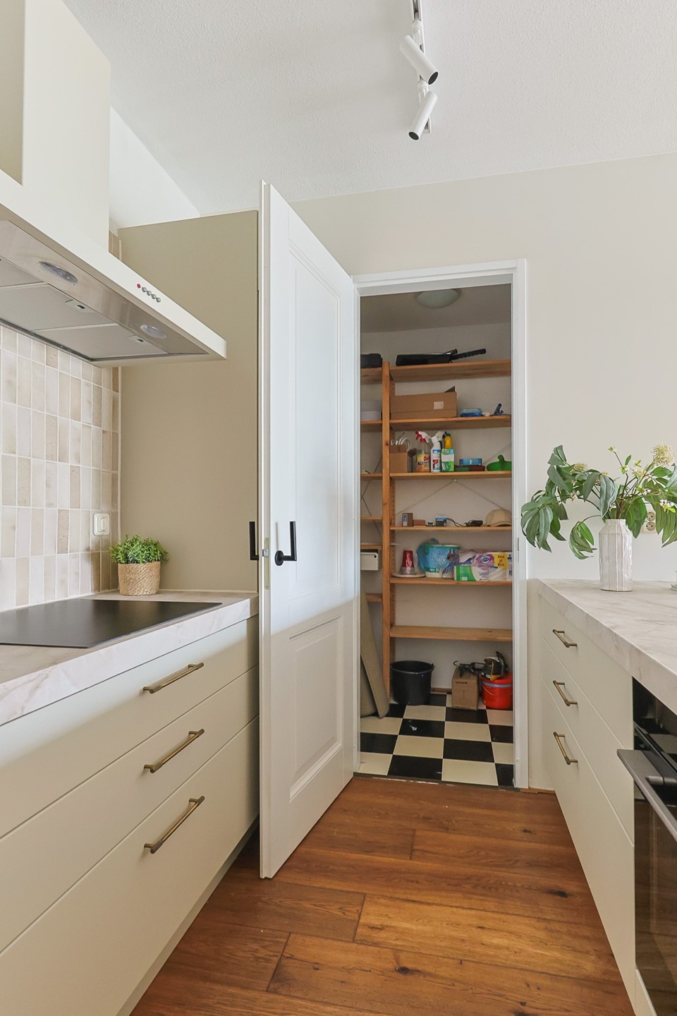 The open kitchen with an island is equipped with a dishwasher, fridge with freezer, gas stove, and oven. The kitchen offers plenty of storage space, partly thanks to the island with cabinets. Next to the kitchen is a pantry with additional storage.
