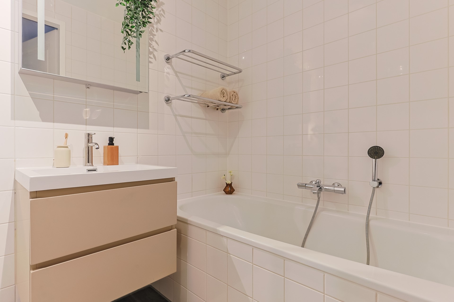 From the hallway, you can access the two spacious bedrooms. The master bedroom features a beautiful built-in wardrobe. The bathroom includes a bathtub, a shower, a sink, and a designer radiator. There is also a separate toilet in the hallway.