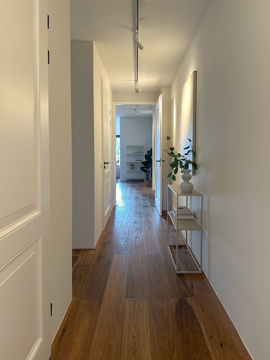 The hallway provides access to all rooms and leads into the spacious living room with French doors opening onto the sunny south-facing terrace overlooking the inner gardens. Here, you can enjoy the sun all day long.
