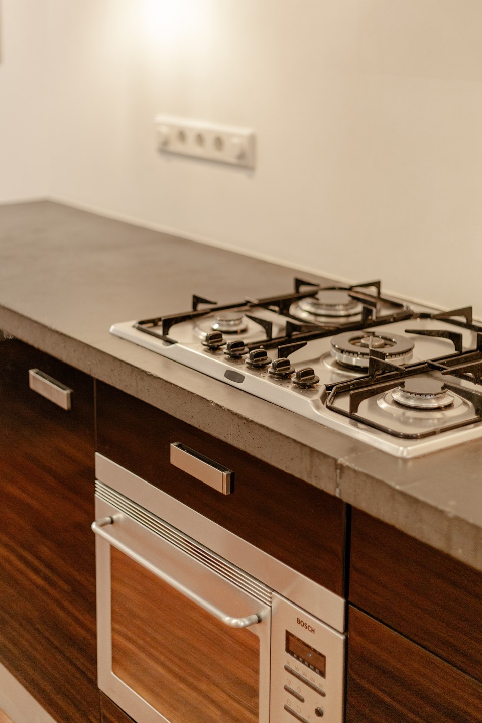 The living room is bright and welcoming, with large front-facing windows and French doors leading to a French balcony, creating an open and pleasant atmosphere. A perfect place to relax or entertain friends. The long kitchen is centrally positioned within the apartment and is functionally designed, featuring a dishwasher, combi oven, under-counter refrigerator, separate freezer, five-burner gas stove and ample storage space. The south-facing balcony, adjacent to the living room, is a lovely spot to enjoy a relaxed drink in the sun.