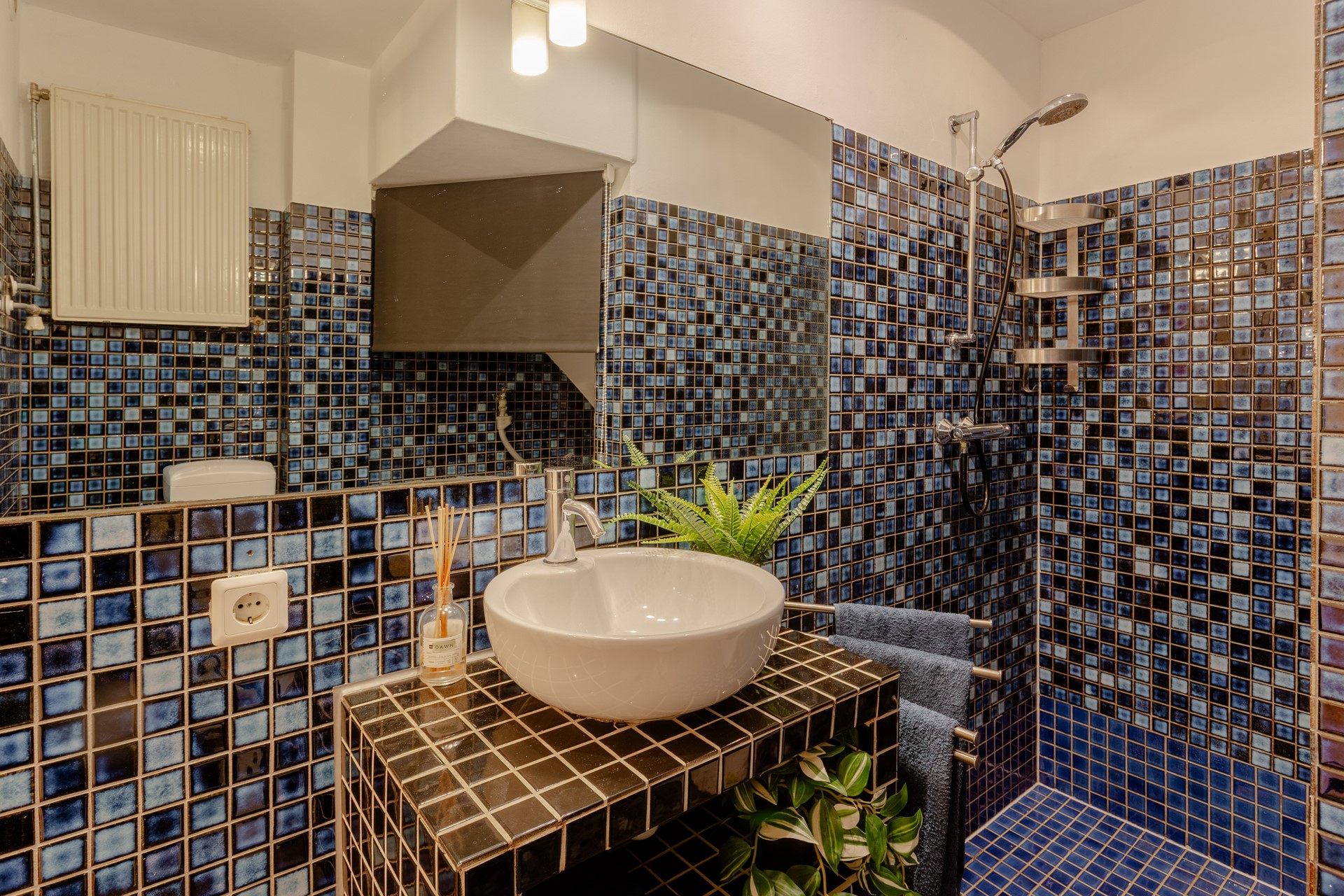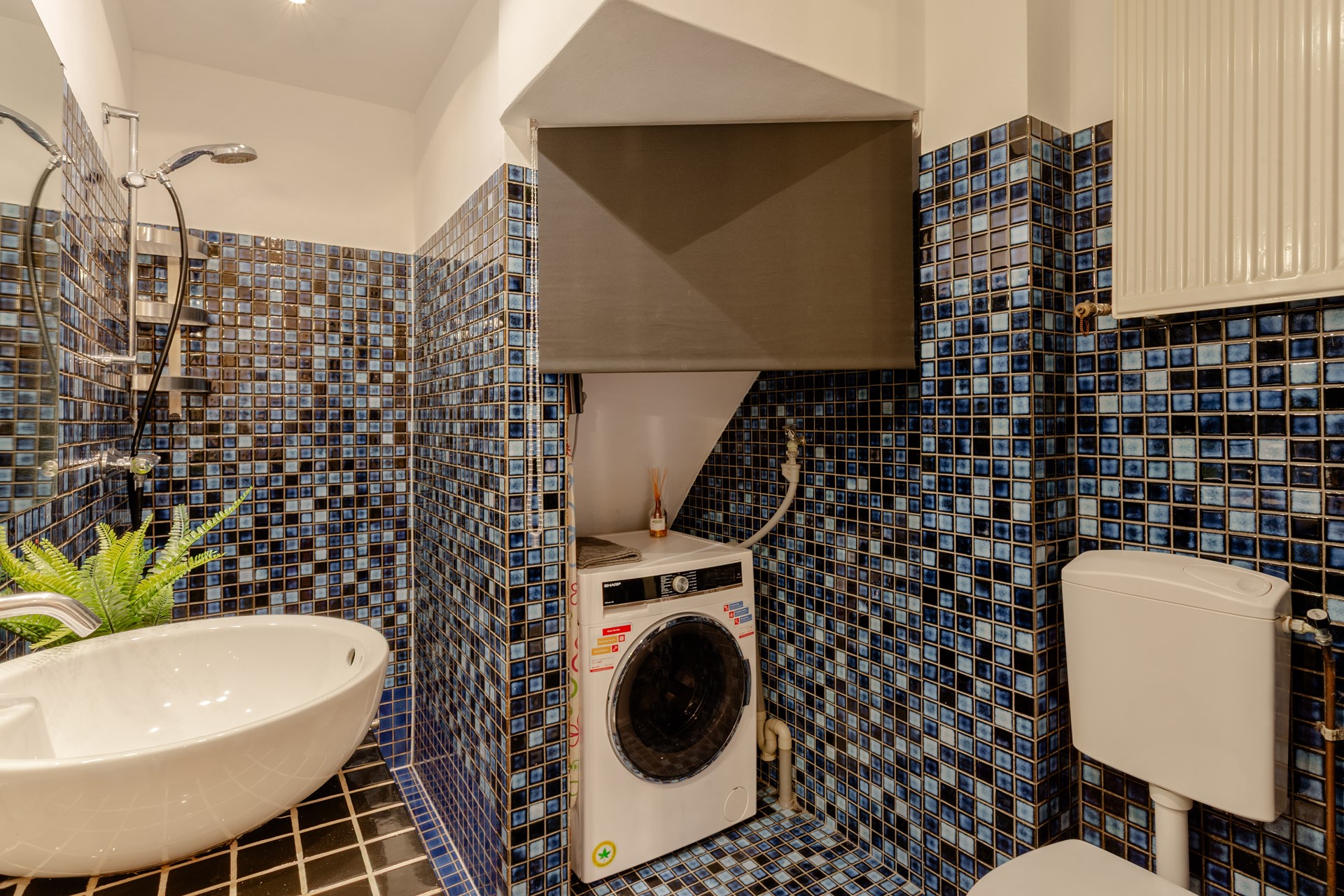 The bathroom is neatly finished and practical in use, equipped with a walk-in shower, washbasin cabinet, toilet and washing machine connection.