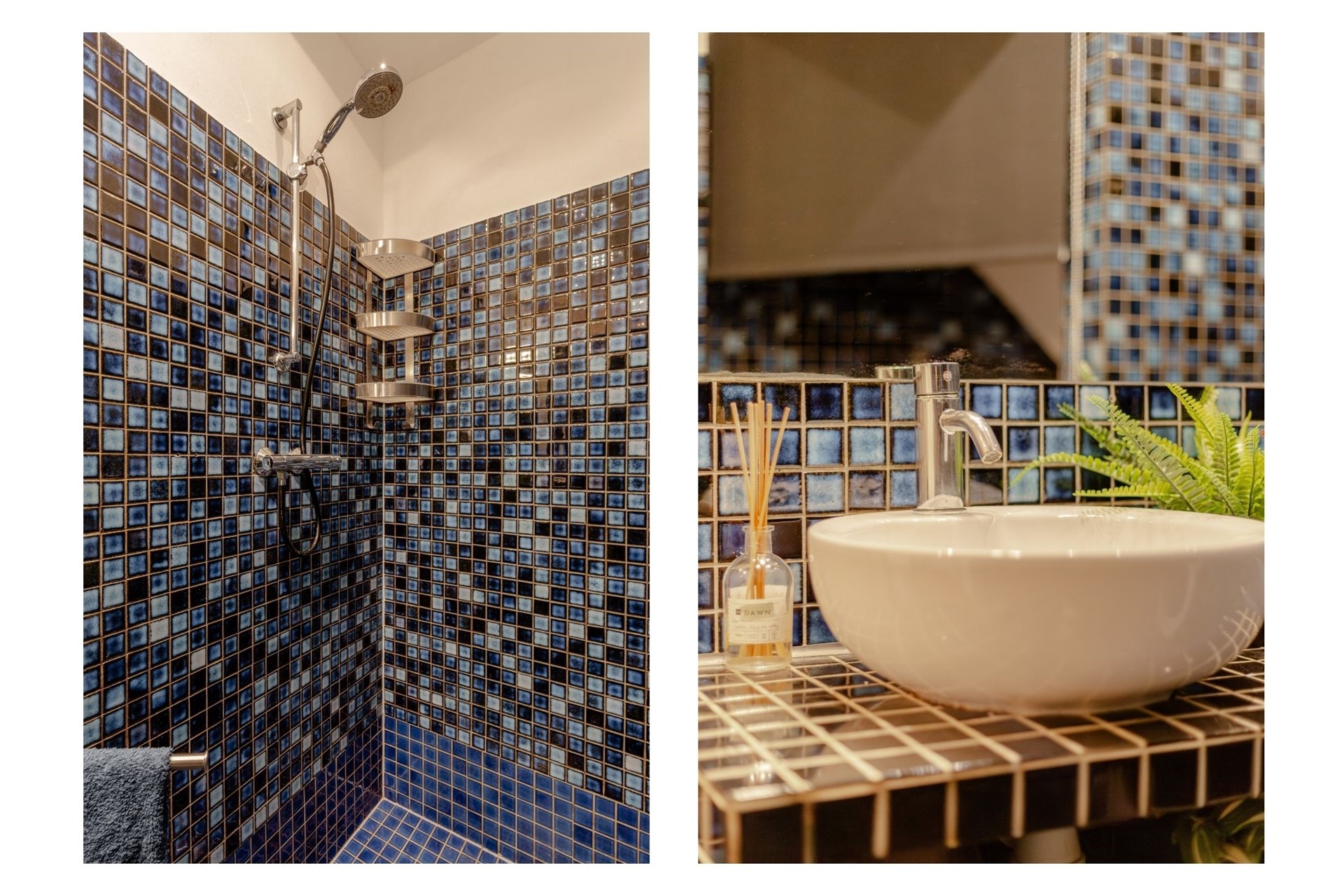 The bedroom is compact yet designed as a full-sized sleeping area, with space for a double bed. Storage has been cleverly addressed: between the bedroom and the bathroom there is a large custom-built wardrobe with four sliding doors. This wardrobe offers surprisingly generous storage space and is suitable for both clothing and household items. A thoughtful solution that creates a calm and well-organized living environment.