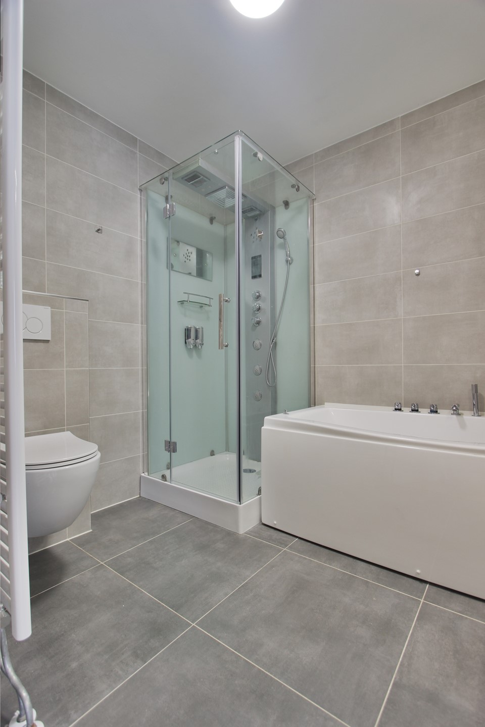Ascend to the first floor, where a central landing leads to 3 bedrooms of varying sizes. The master bedroom impresses with its generous proportions and ample closet space, while the modern bathroom indulges with a luxurious whirlpool jacuzzi, sleek shower cabin, stylish vanity unit, and a second toilet.