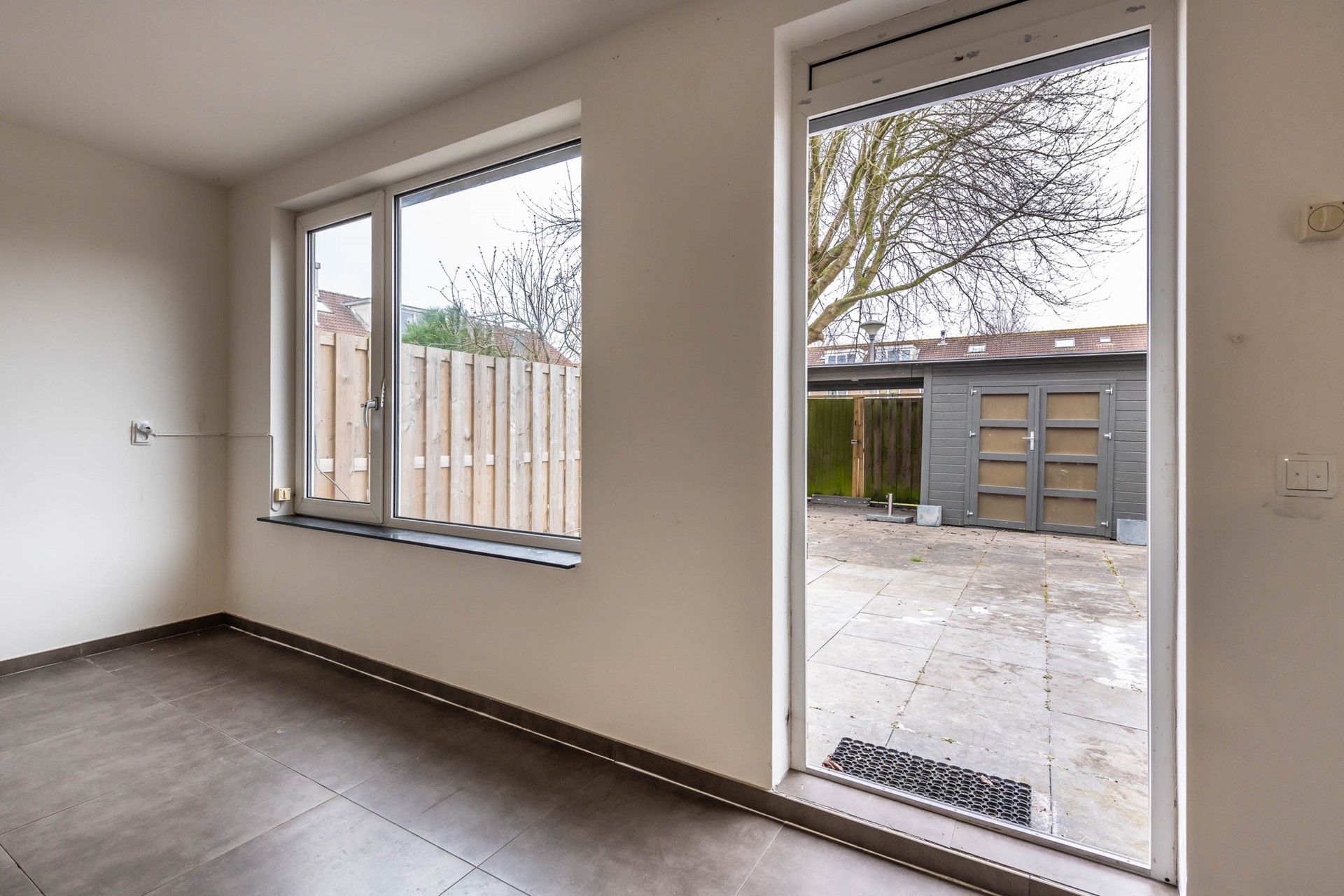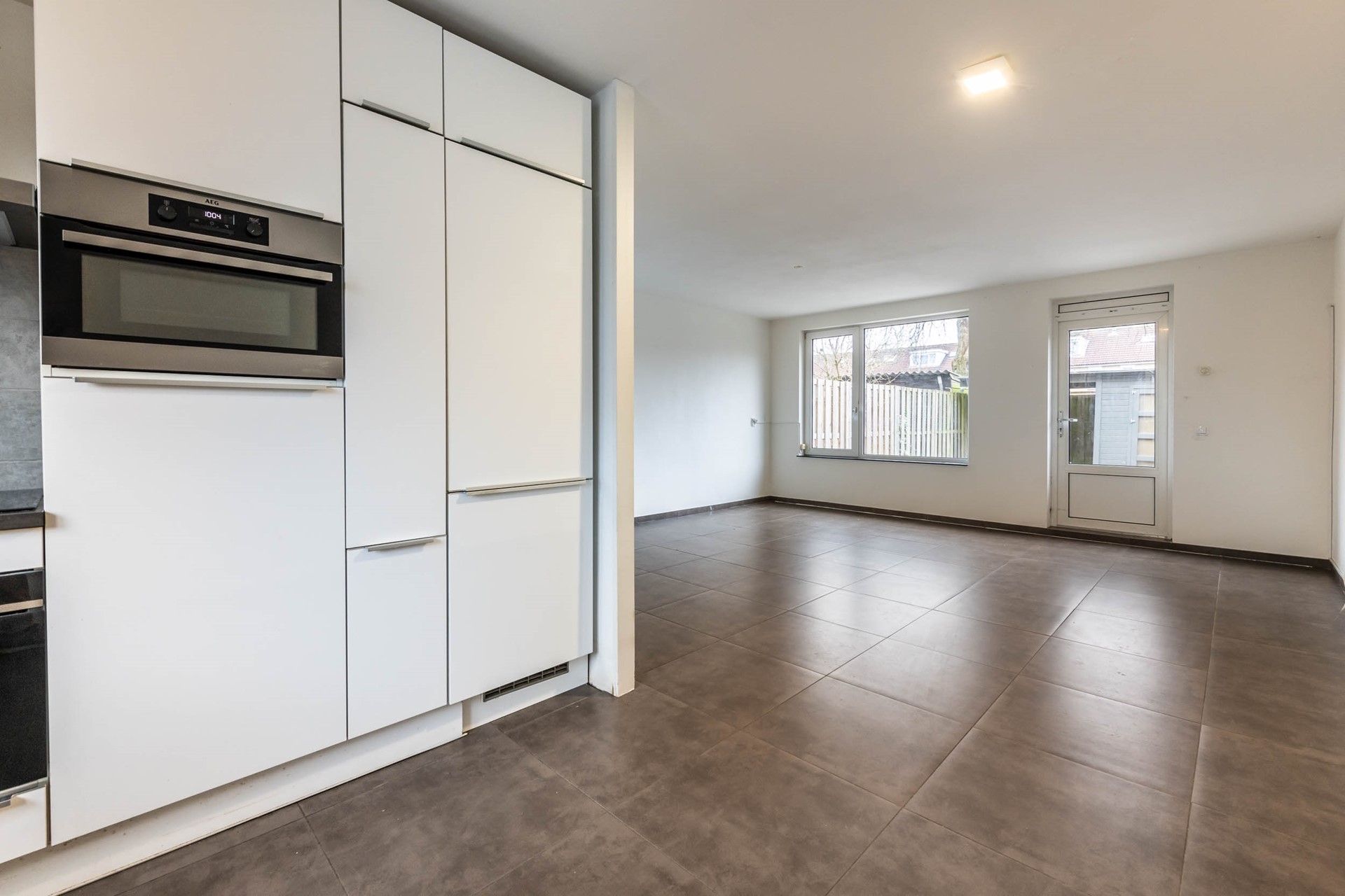 As you continue through the home, you enter the bright and spacious living room with an open-plan kitchen. The kitchen is equipped with built-in appliances and offers ample workspace and storage. Large windows allow plenty of natural light and provide a lovely view of the generous backyard. The garden also includes a large shed, perfect for storage, bicycles, or hobbies.
