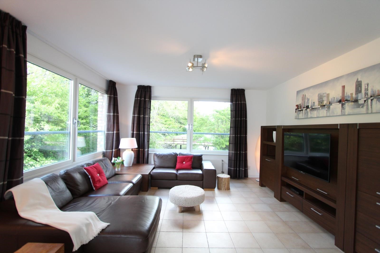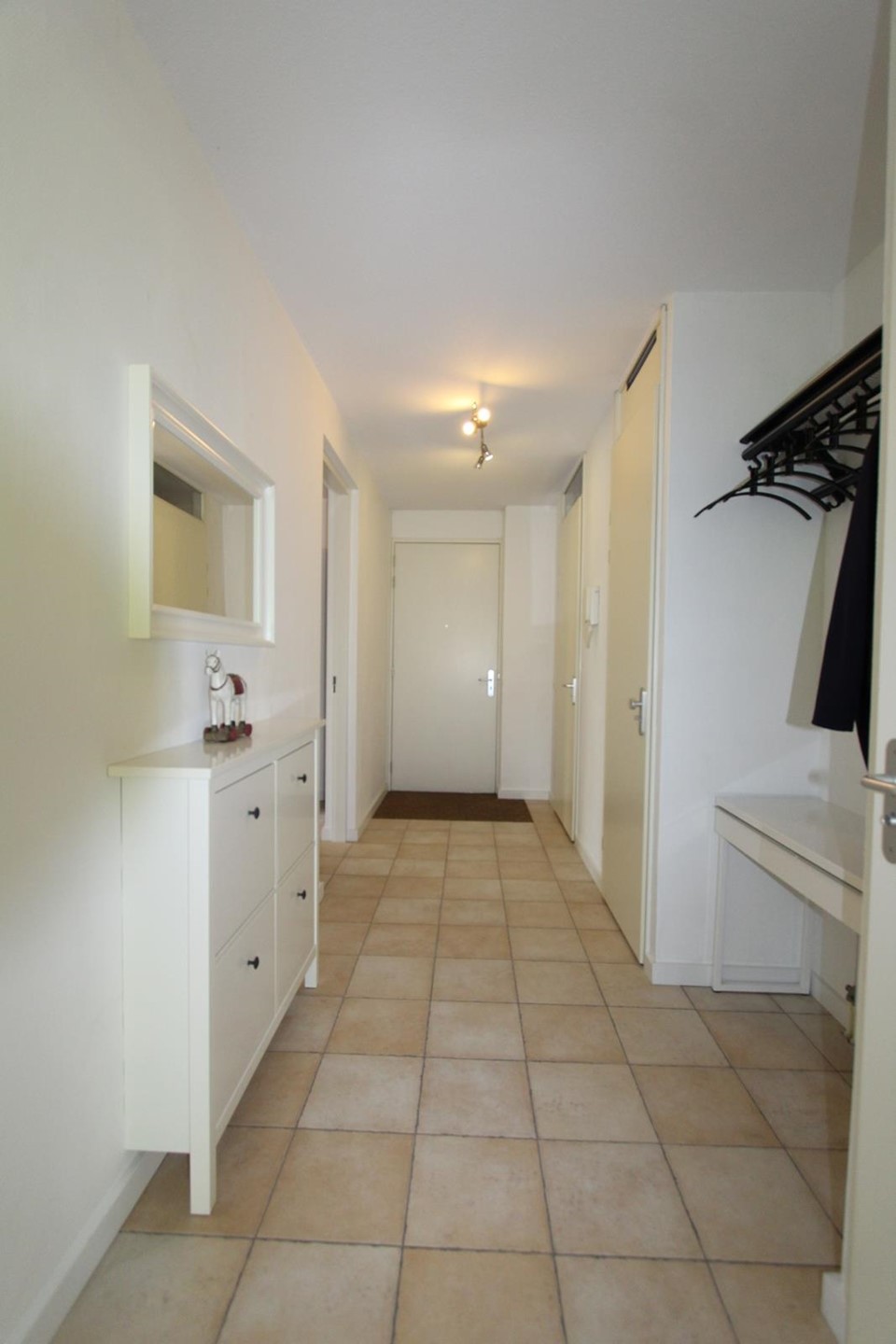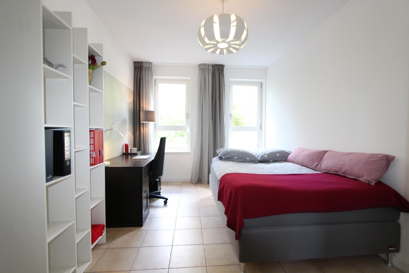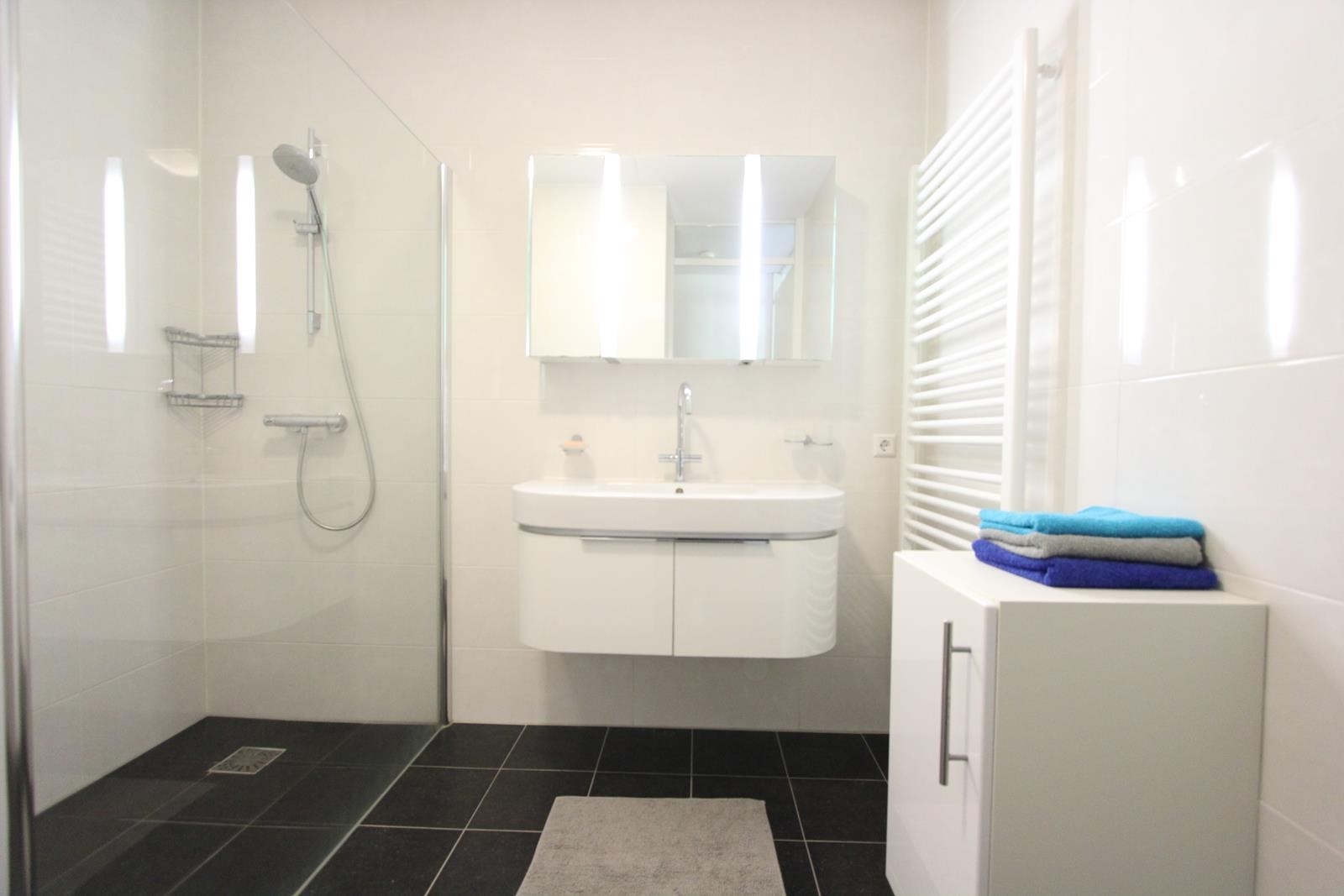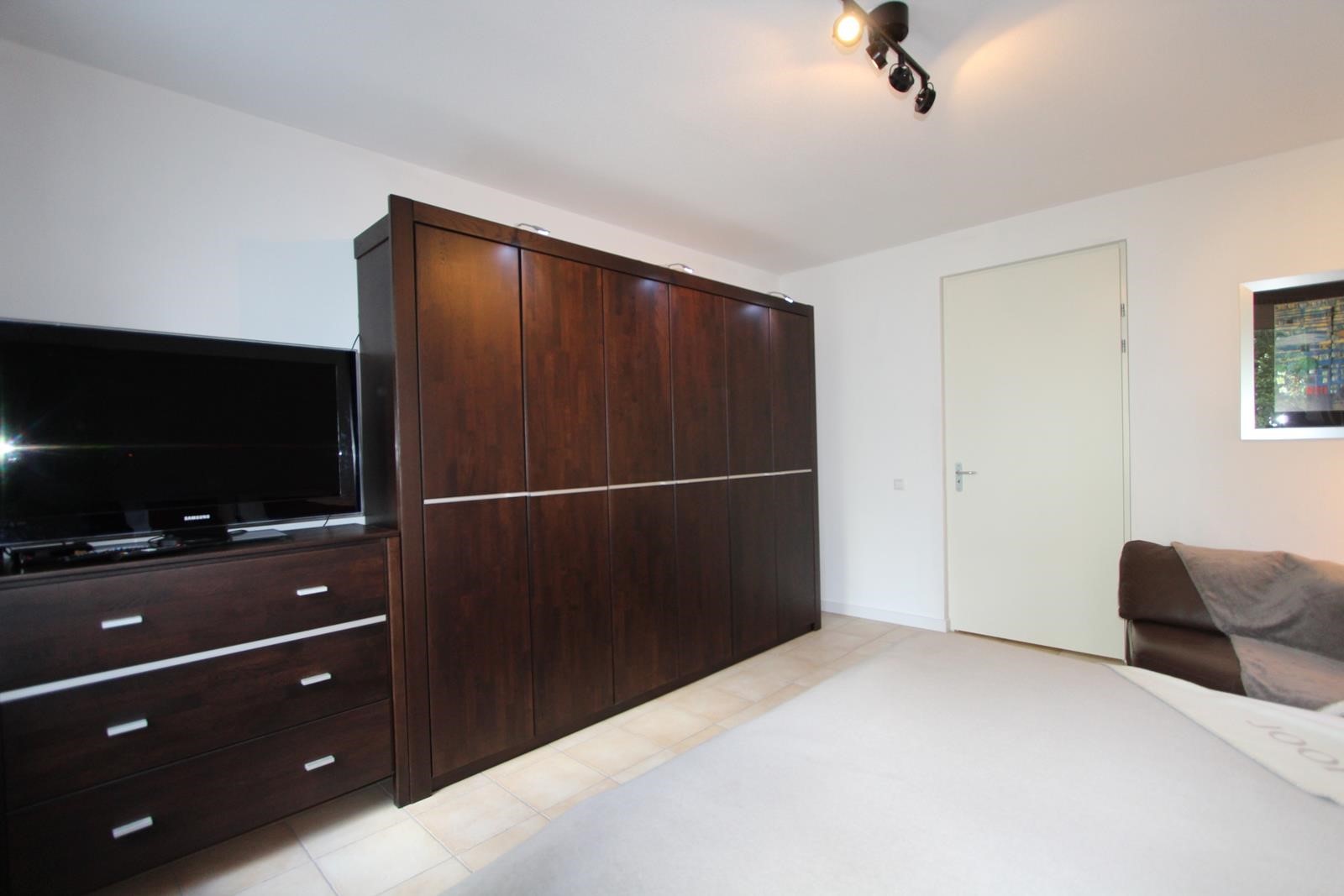 The apartment has tiled floors with underfloor heating and is completely furnished, including an Android flat screen TV set. The fully equipped open kitchen adjoins a closed 5 m2 storage room where also the washing machine and dryer are situated. The bathroom is equipped with a walk-in shower. There is a separate toilet room.