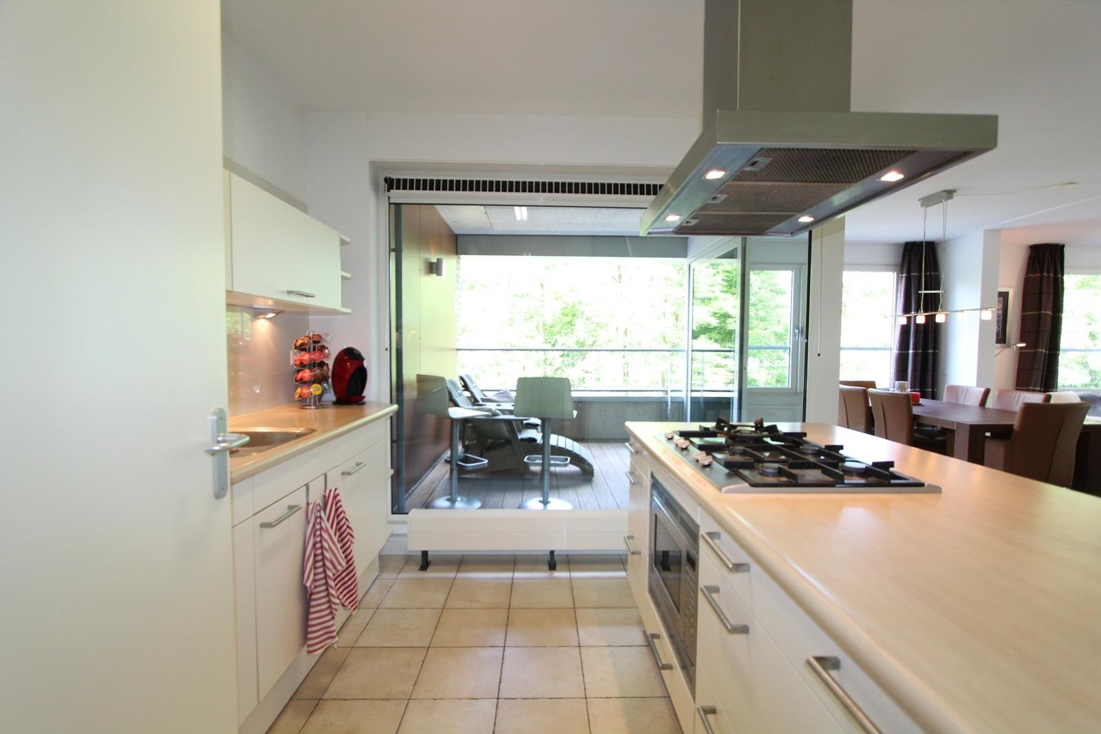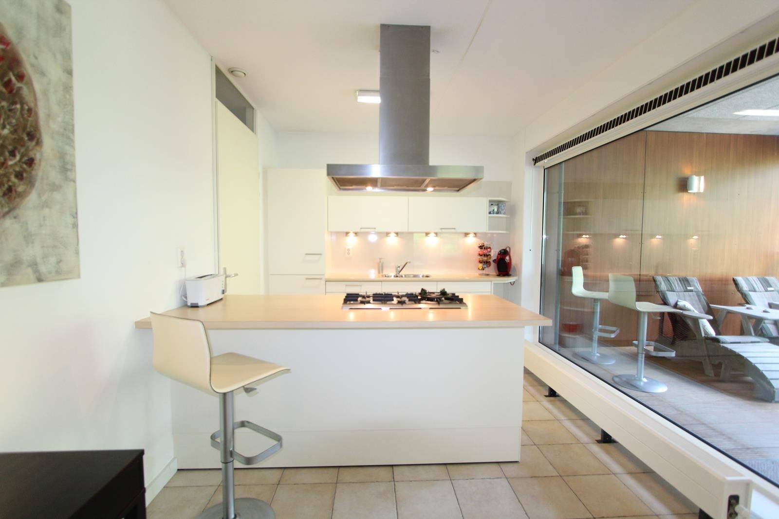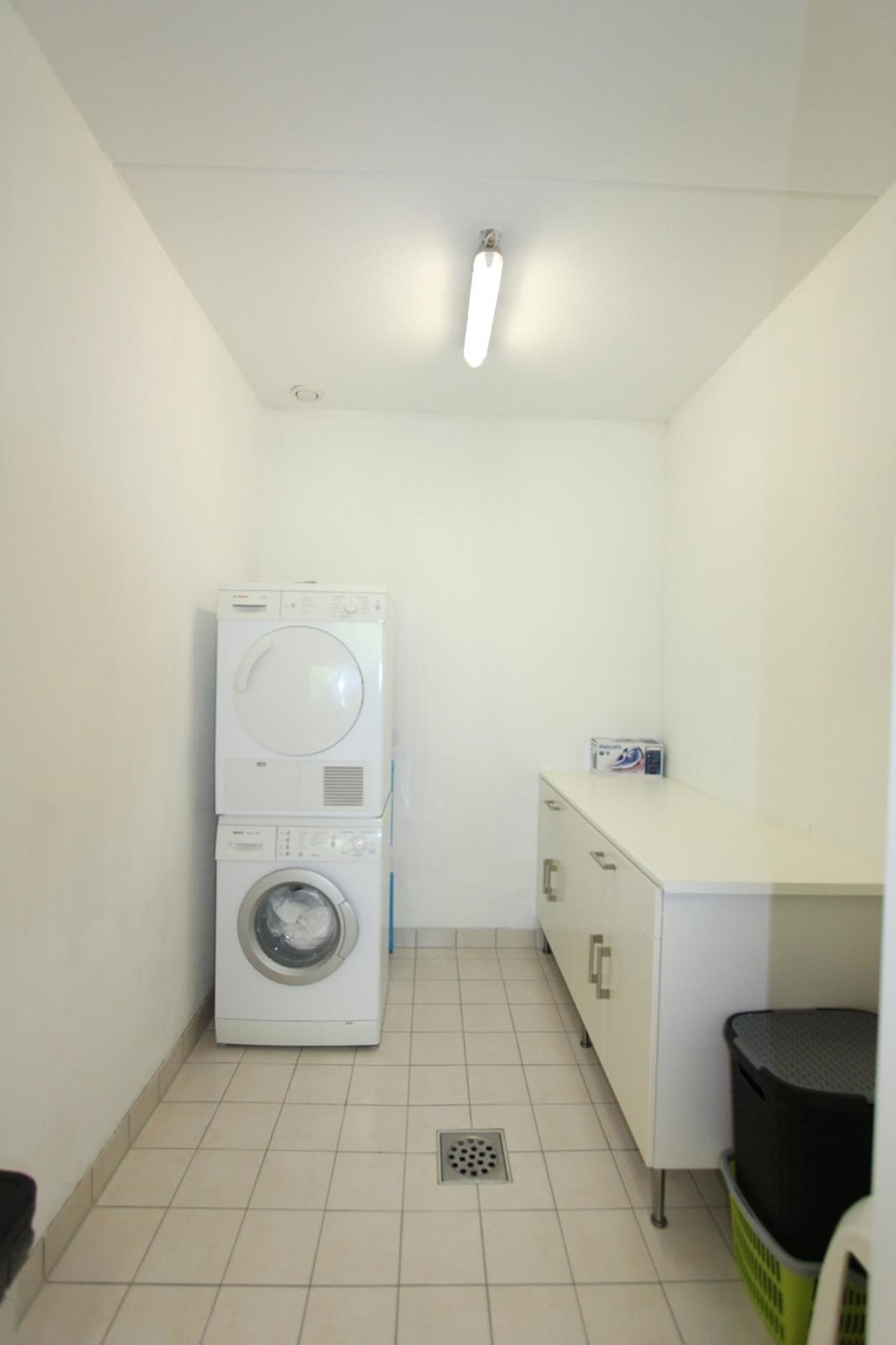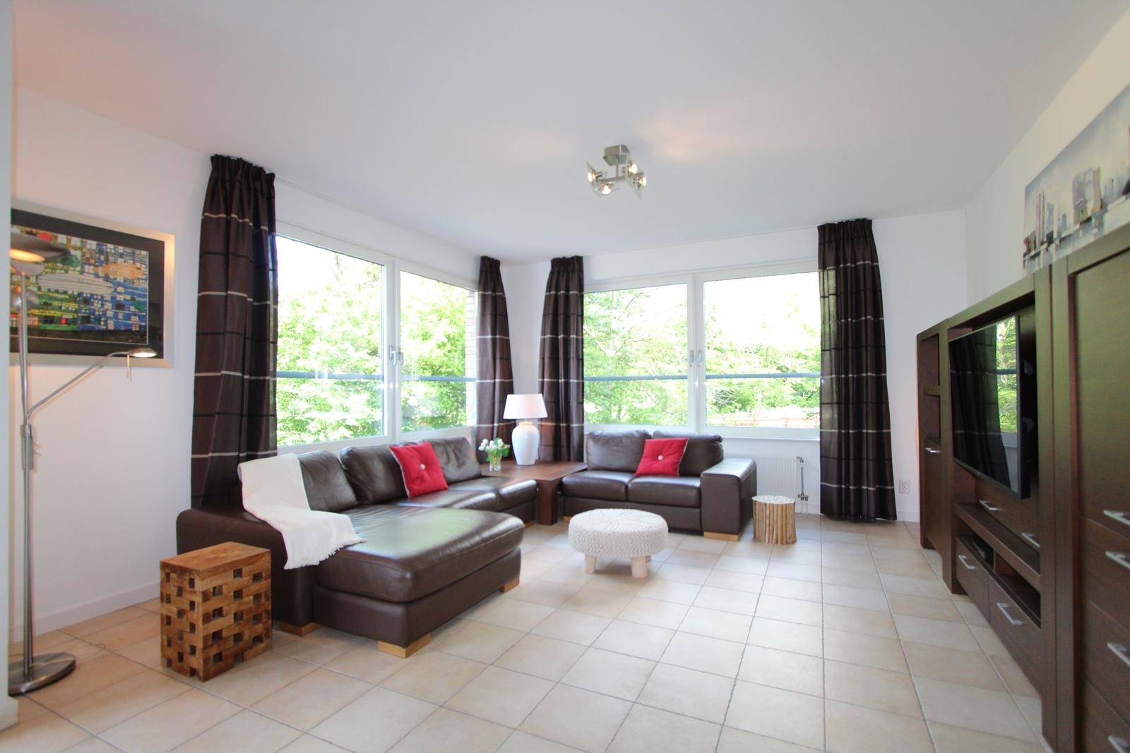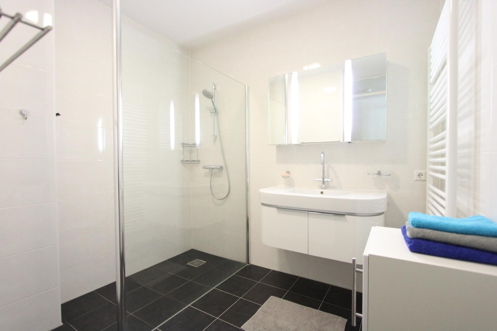 The apartment has tiled floors with underfloor heating and is completely furnished, including an Android flat screen TV set. The fully equipped open kitchen adjoins a closed 5 m2 storage room where also the washing machine and dryer are situated. The bathroom is equipped with a walk-in shower. There is a separate toilet room.
