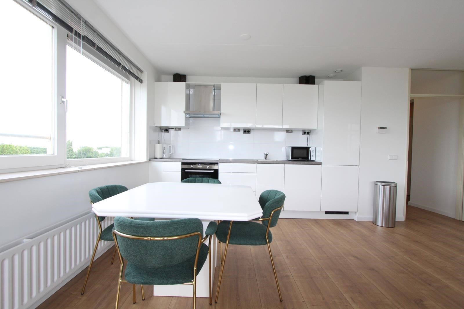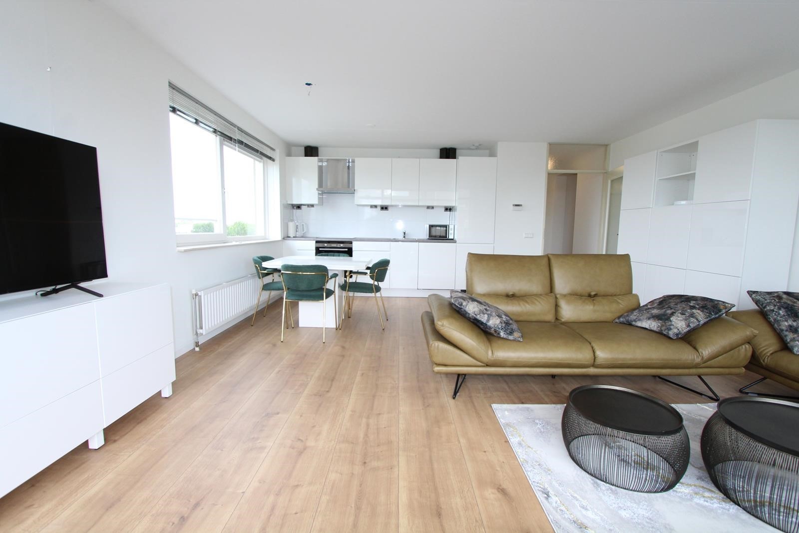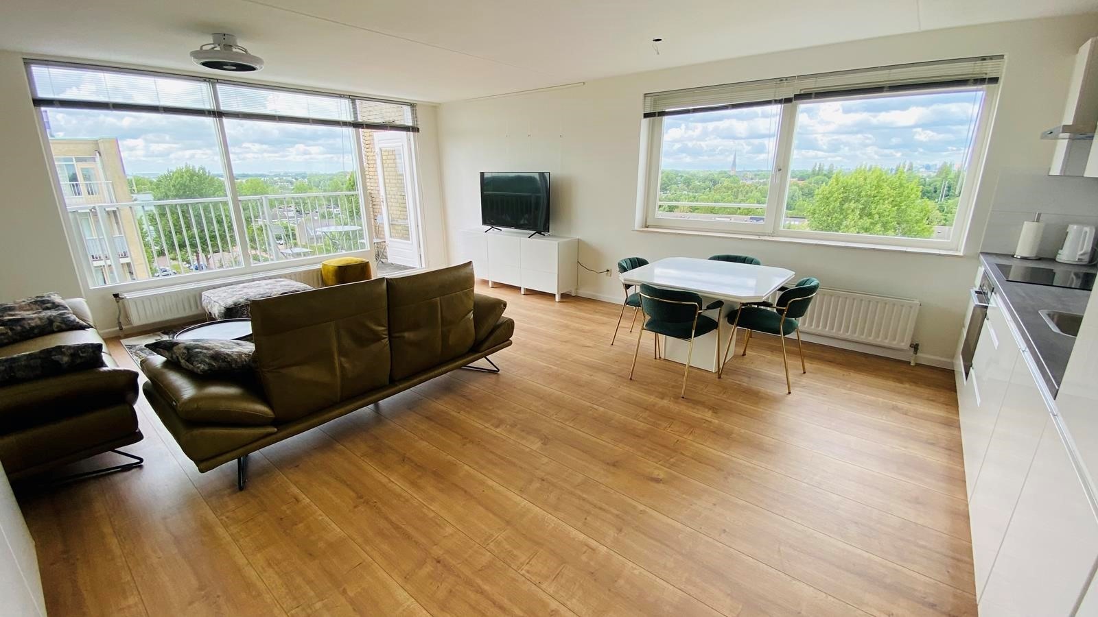 The apartment is on the eigth floor which is the topfloor. You have a beautiful view over the forest and when you lie on the couch you see how beatiful the sky is. Nice green area and very good to jog or walk and relax.