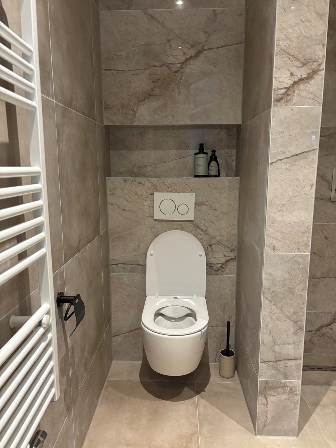 De master bedroom ligt aan de voorzijde van de woning en is ruim van opzet. Het bed zal aanwezig zijn, ook al is dit niet zichtbaar op de huidige foto’s. De moderne badkamer is voorzien van een luxe inloopdouche, wastafelmeubel, zwevend toilet en handoekenradiator. Daarnaast is er een aparte kast met wasmachine- en drogeraansluiting, mechanische ventilatie en een grote boiler voor warm water.