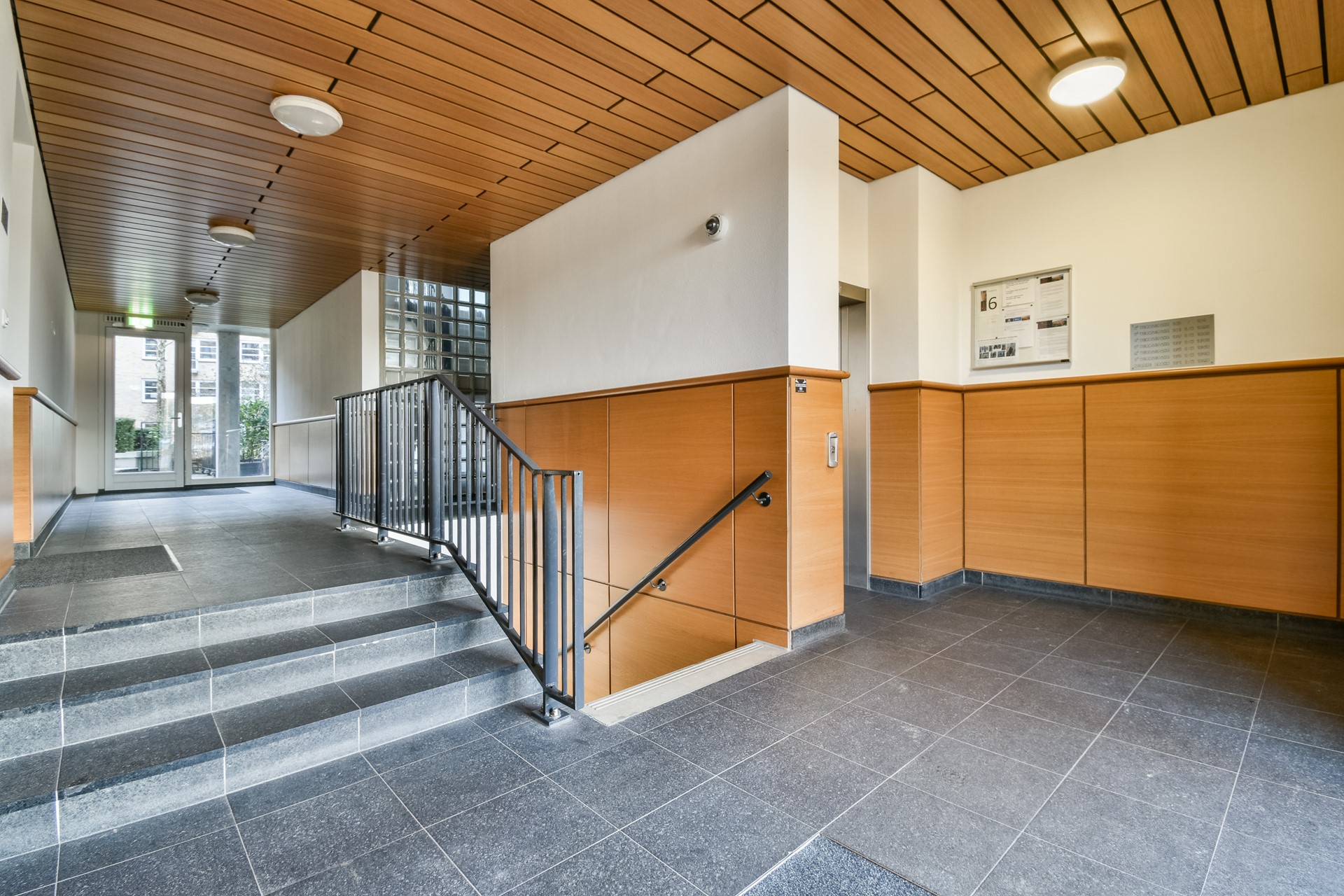The elevator takes you to the 5th floor of the complex, where you can walk to the entrance of the apartment. You enter the apartment through the hallway on the inside of the building. From here, you reach both bedrooms, and the master bedroom has direct internal access to the bathroom.