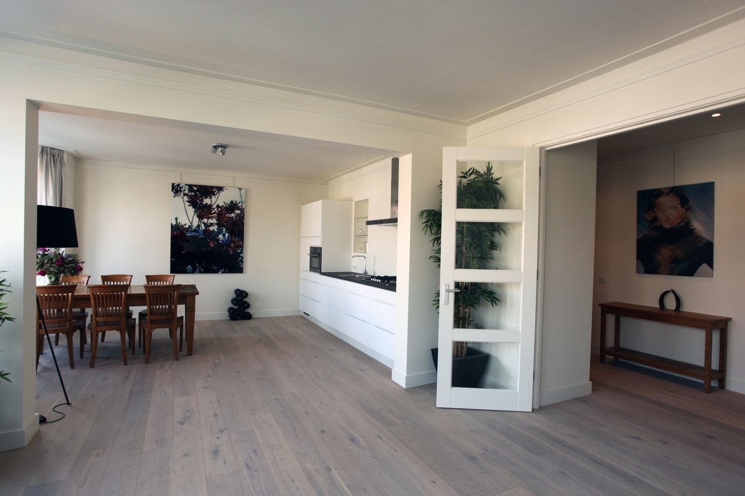 The large living room has a magnificent view of the Amstel canal. The open kitchen has a built in refrigerator and freezer, a combi microwave oven and a gas top stove. A nespresso machine and other needful equipment is available. The dining table at the window seats 6 people. The other side of the room has a modern couch and television.