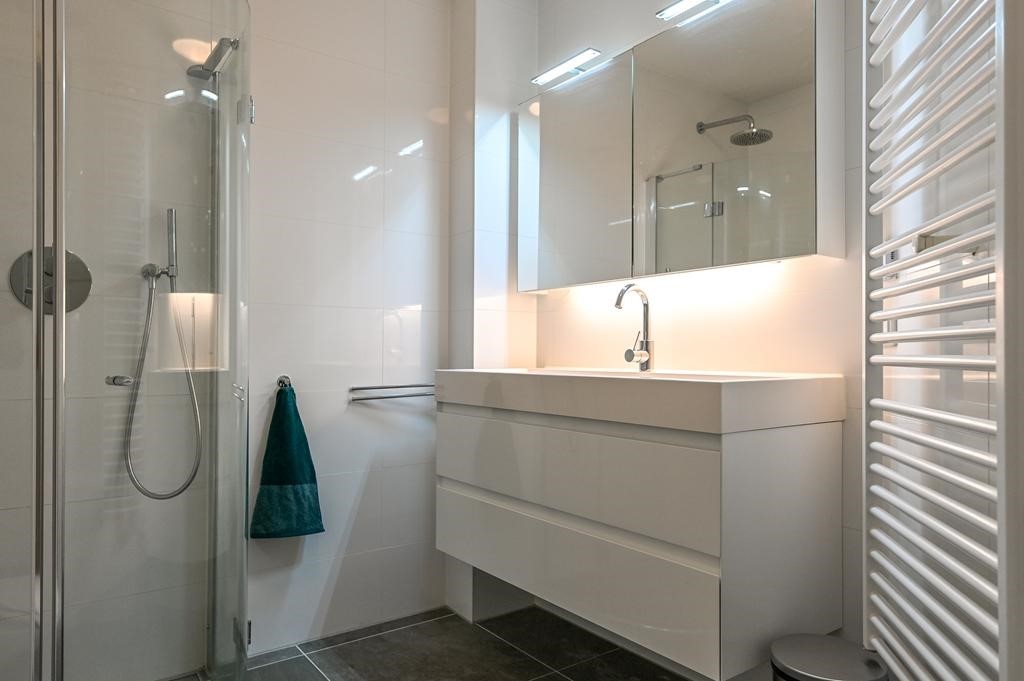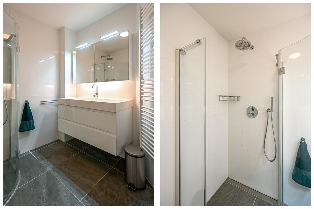 The bathroom is equipped with a walk-in shower, a double wash basin and a toilet.