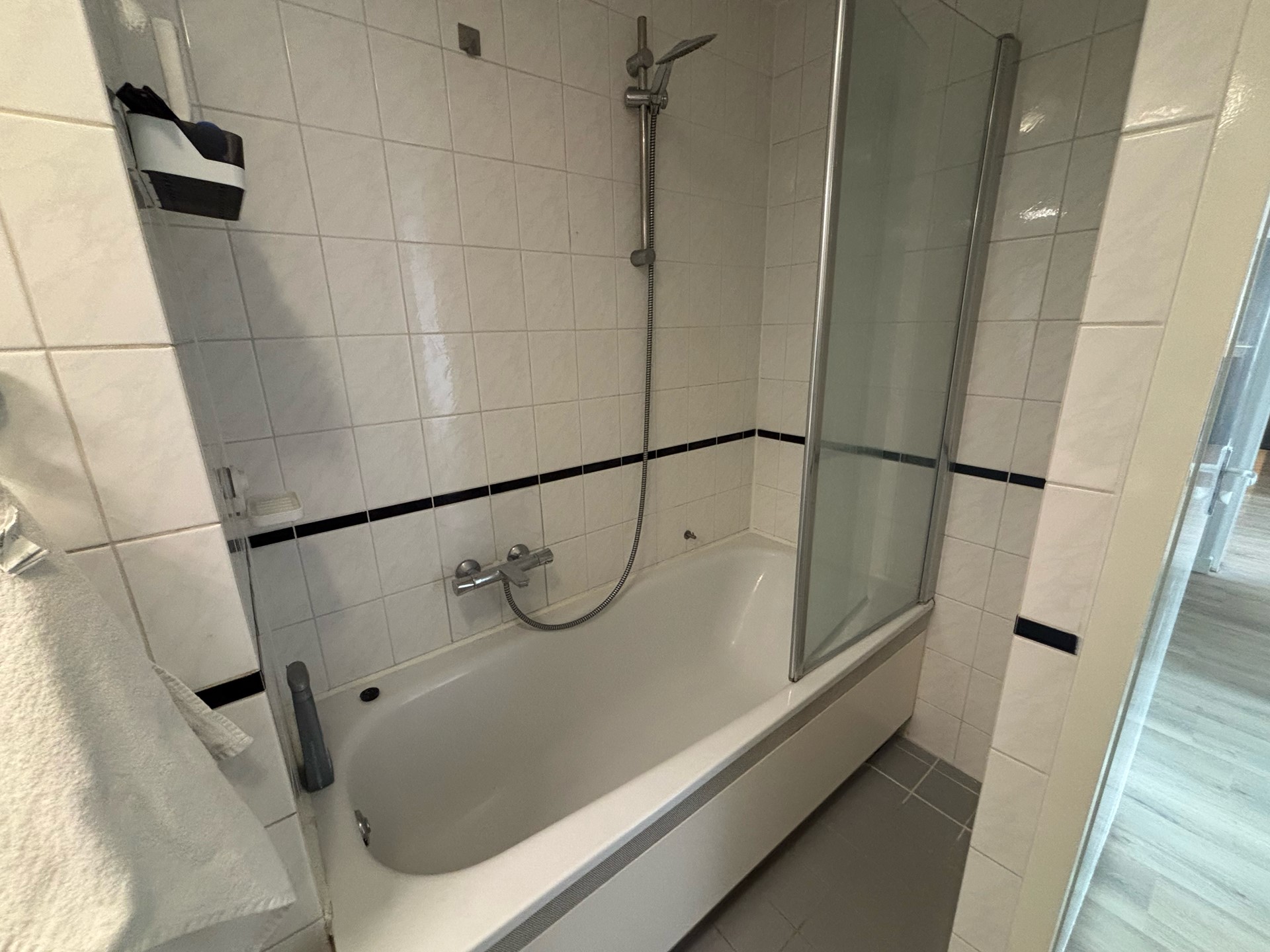 De ruime badkamer is voorzien van bad, wastafel met meubel en een wasmachine. Grote slaapkamer bevindt zich aan de voorzijde van het appartement en is voorzien van kast en bed. De meer compacte slaapkamer is eveneens ingericht met een bed en kast en geeft daarnaast toegang tot het balkon, net als de woonkamer.
