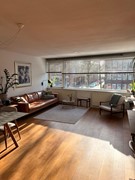 Upon entering, you are welcomed into a spacious and light-filled living area, enhanced by large windows with double glazing that overlook a charming tree-lined street. The space is tastefully furnished with stylish furniture and artwork, creating a warm and inviting atmosphere—perfect for both relaxing and entertaining.