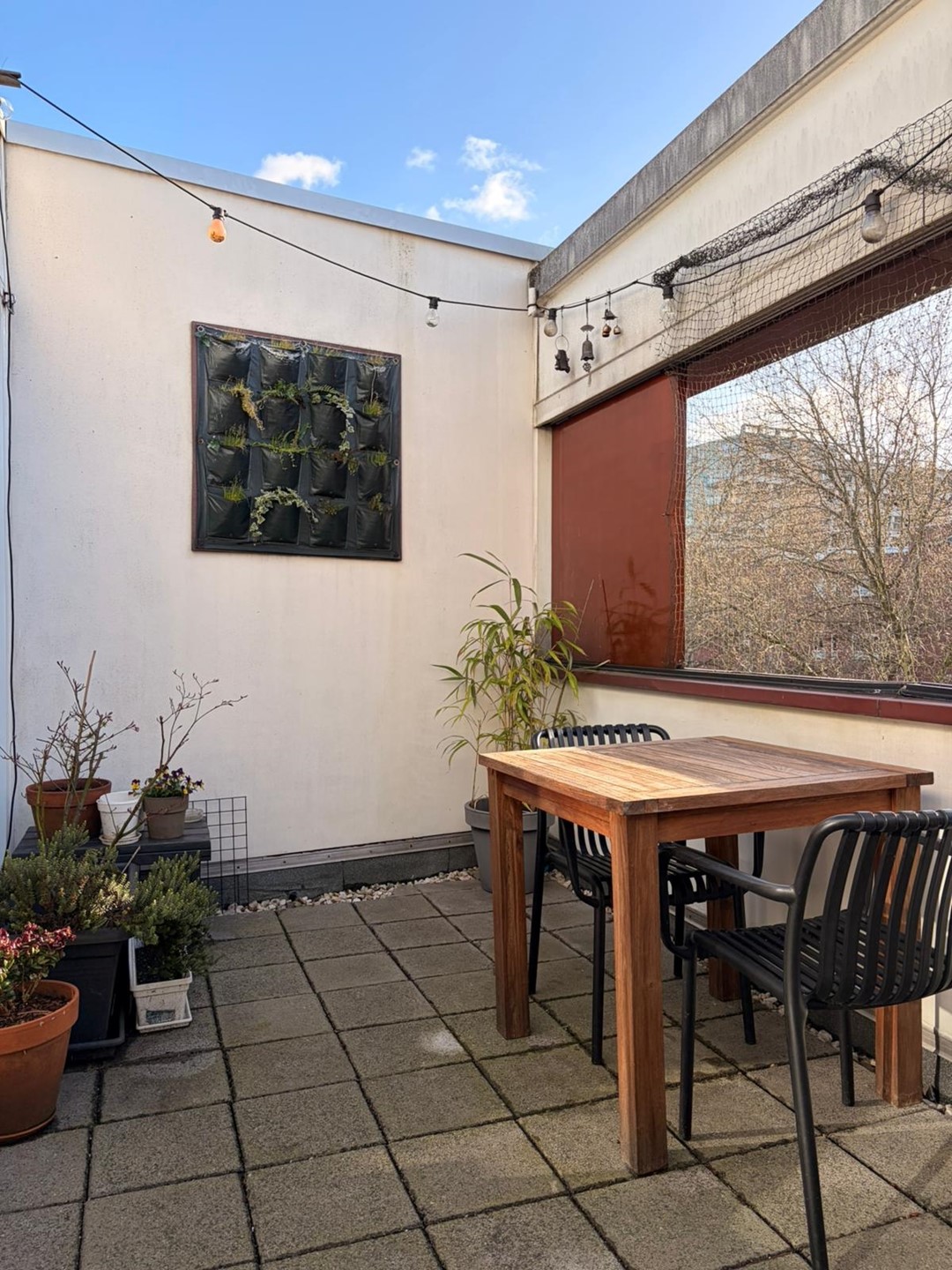 Upstairs, the spacious bedroom provides a calm and private retreat. It benefits from a large wardrobe and direct access to a lovely terrace—complete with plants and soft fairy lighting—creating a tranquil outdoor space to unwind.