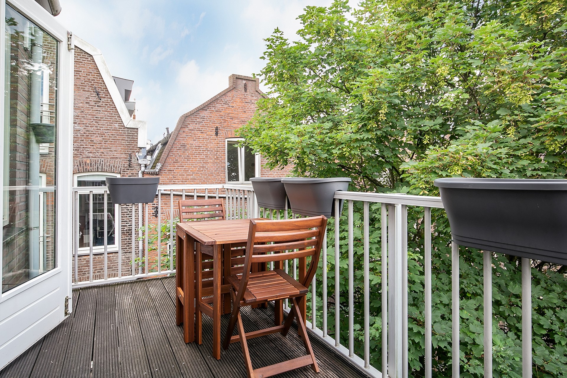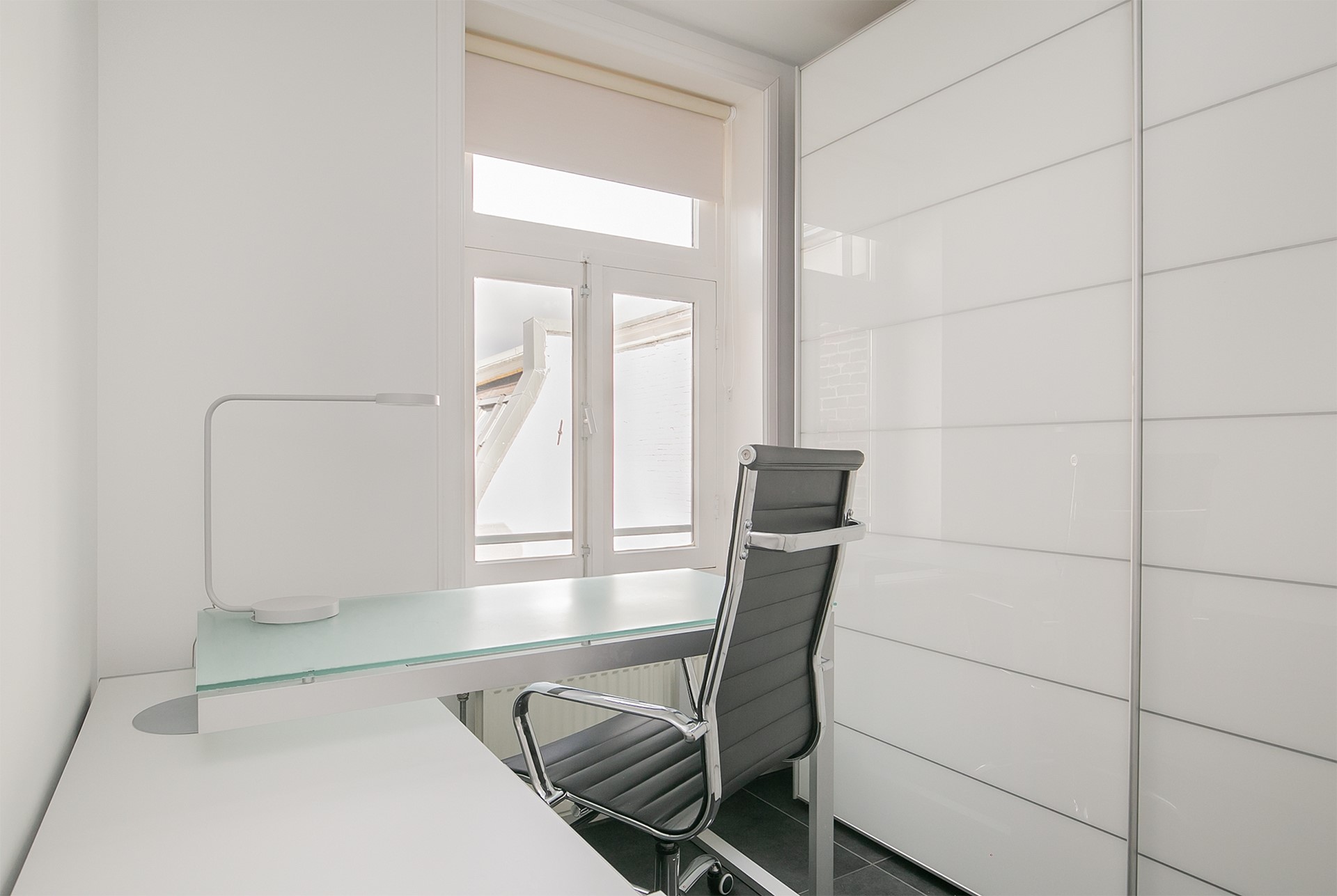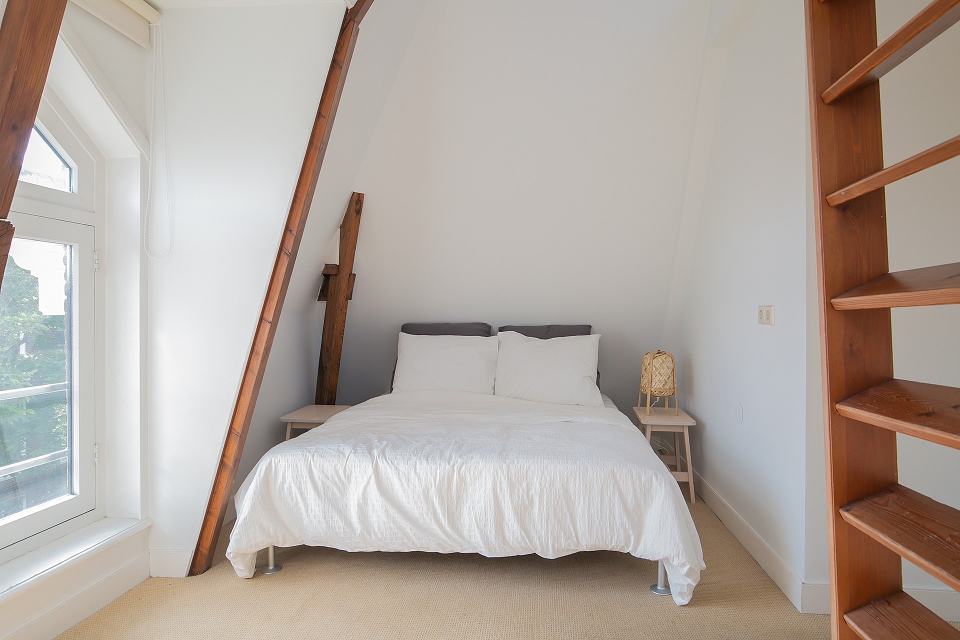 The primary bedroom is situated at the front side of the building and is overlooking the quiet Da Costastraat. Through a small staircase, you can reach another room underneath the roof where the bed could also be placed.