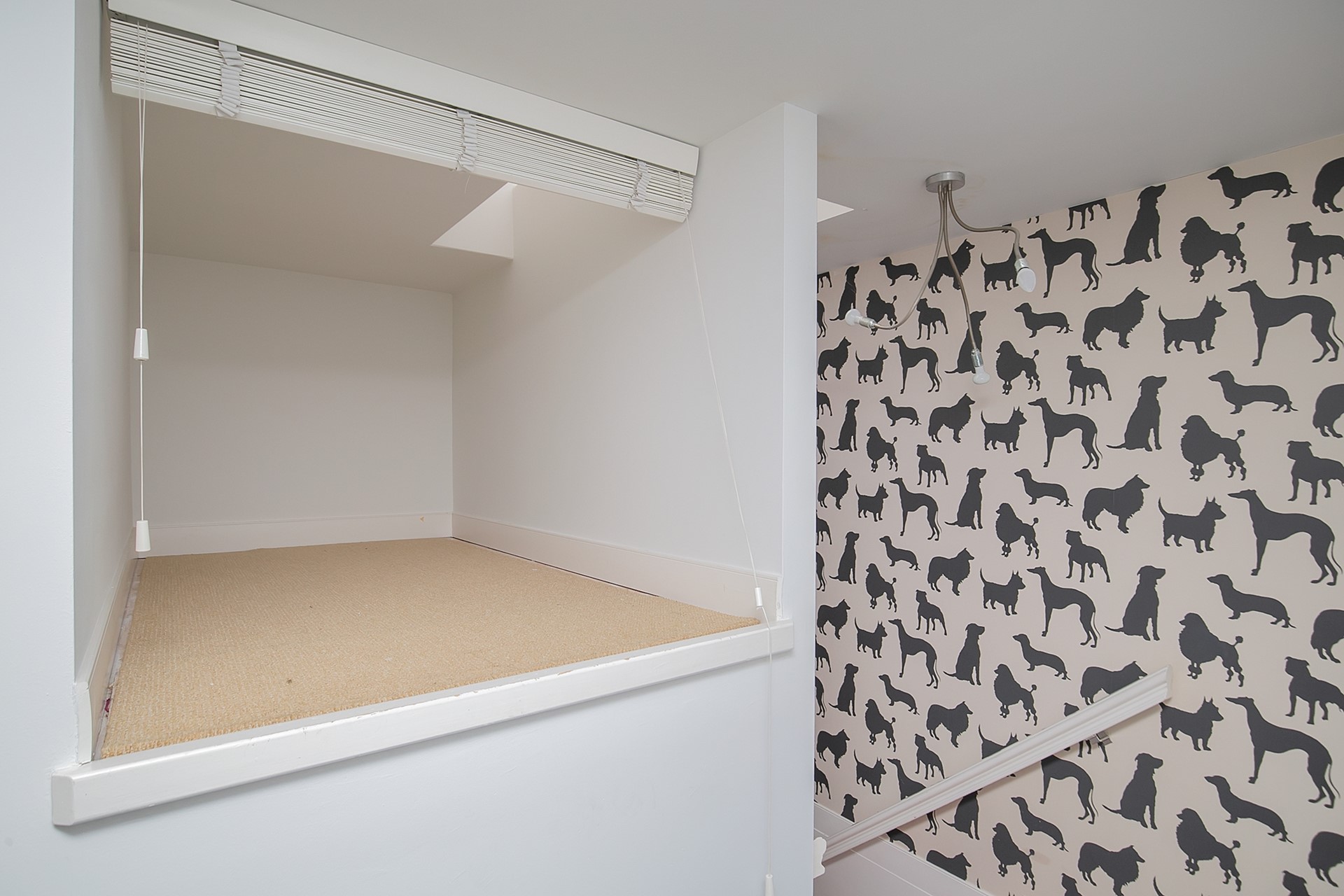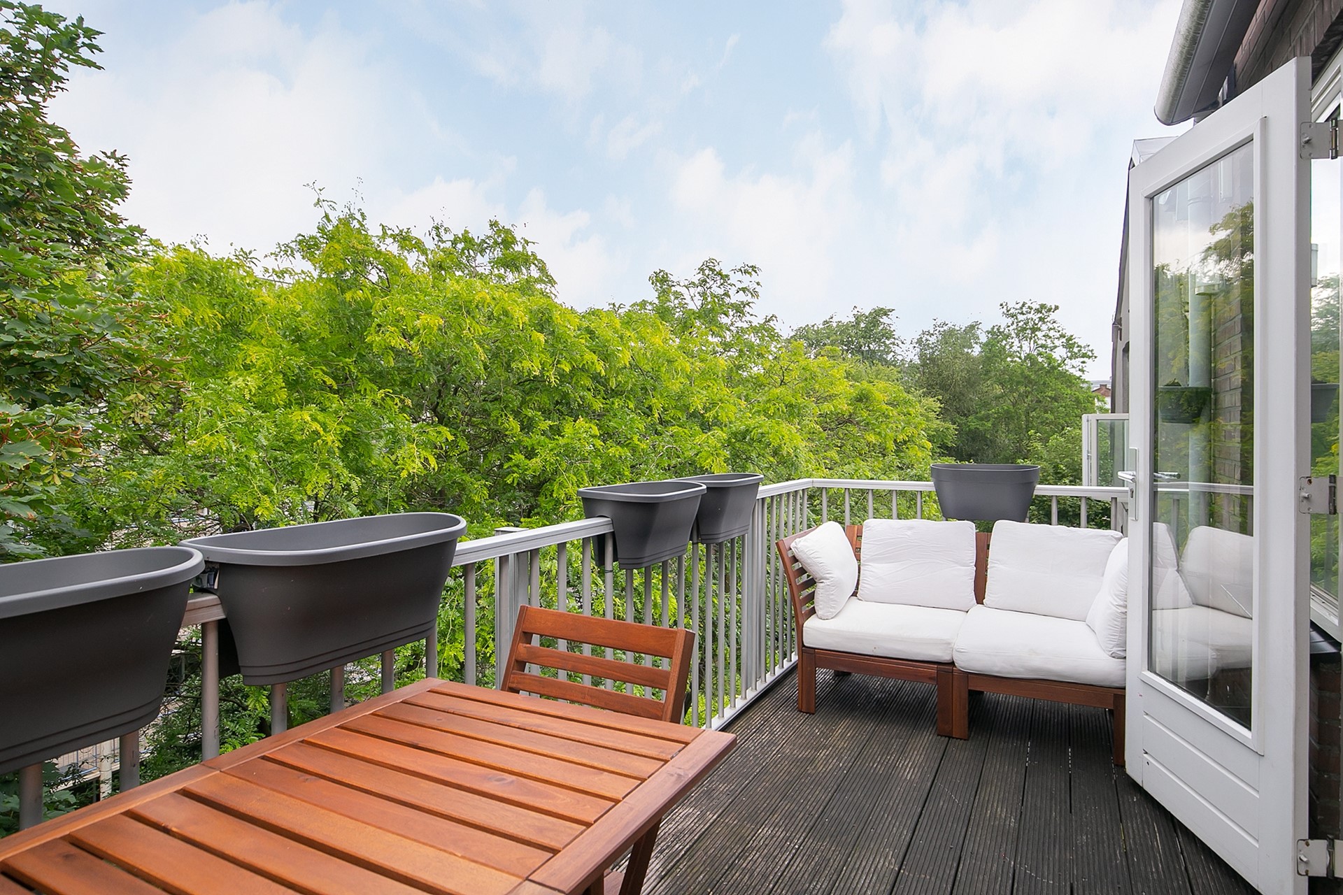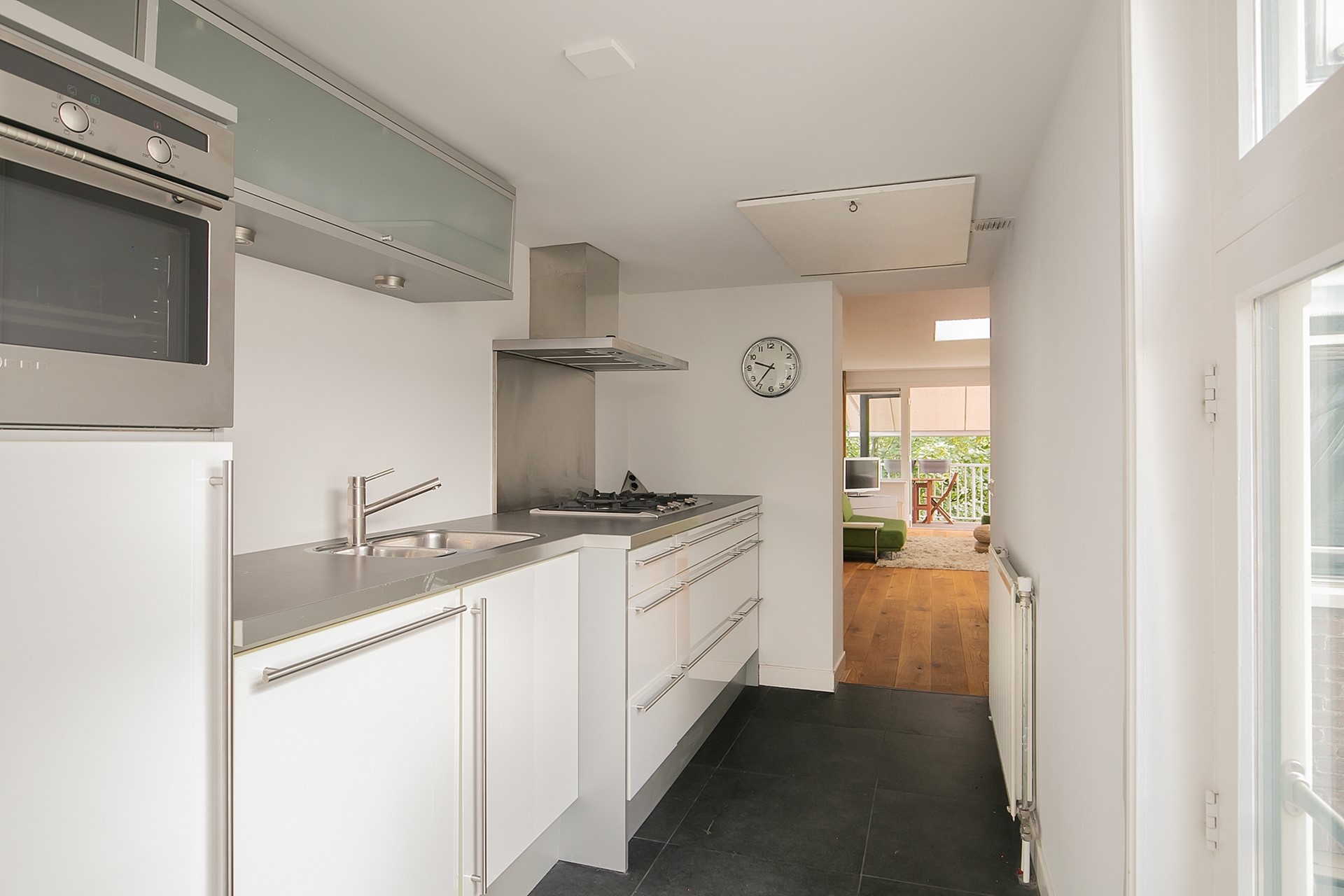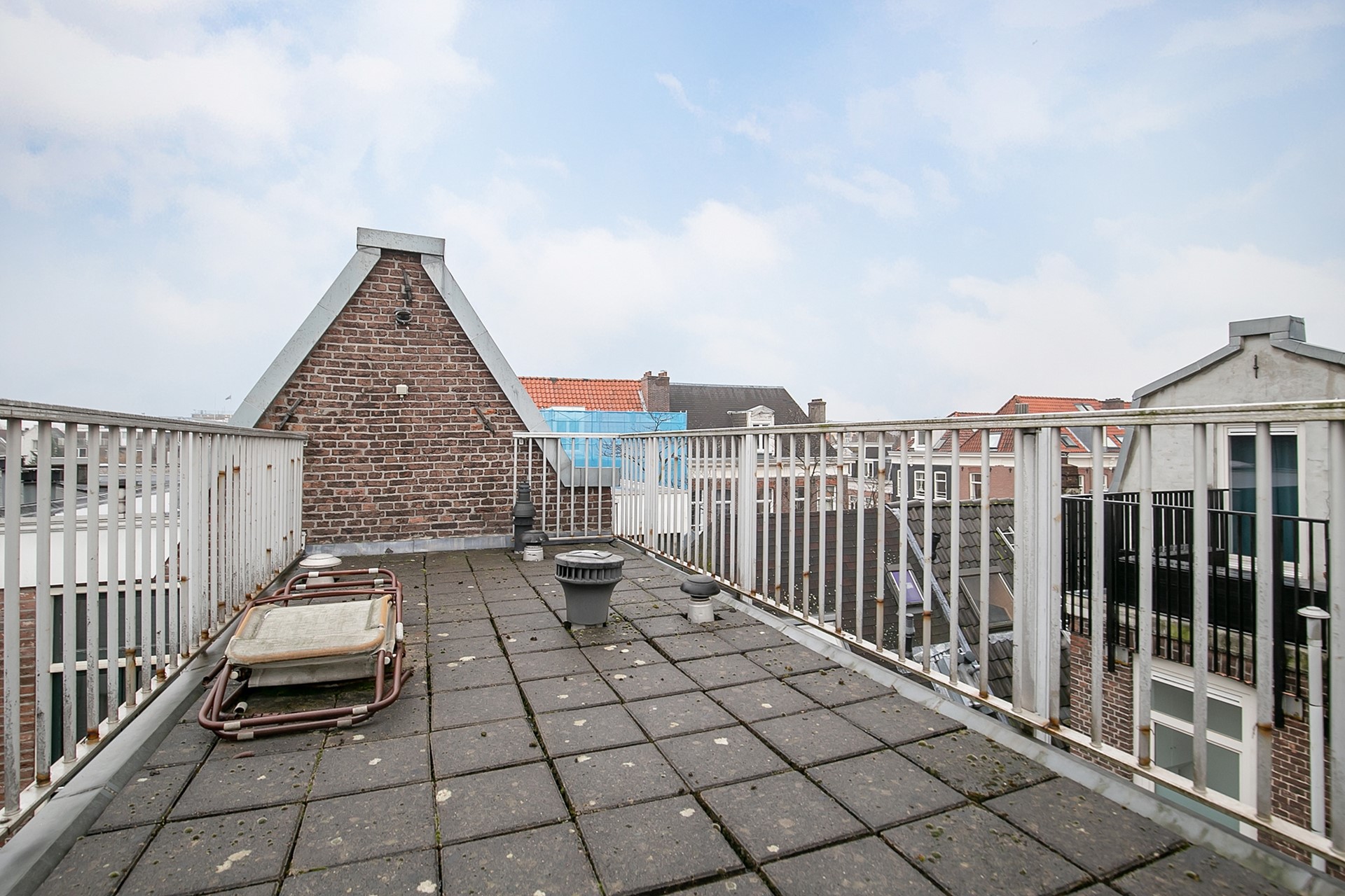 The primary bedroom is situated at the front side of the building and is overlooking the quiet Da Costastraat. Through a small staircase, you can reach another room underneath the roof where the bed could also be placed.