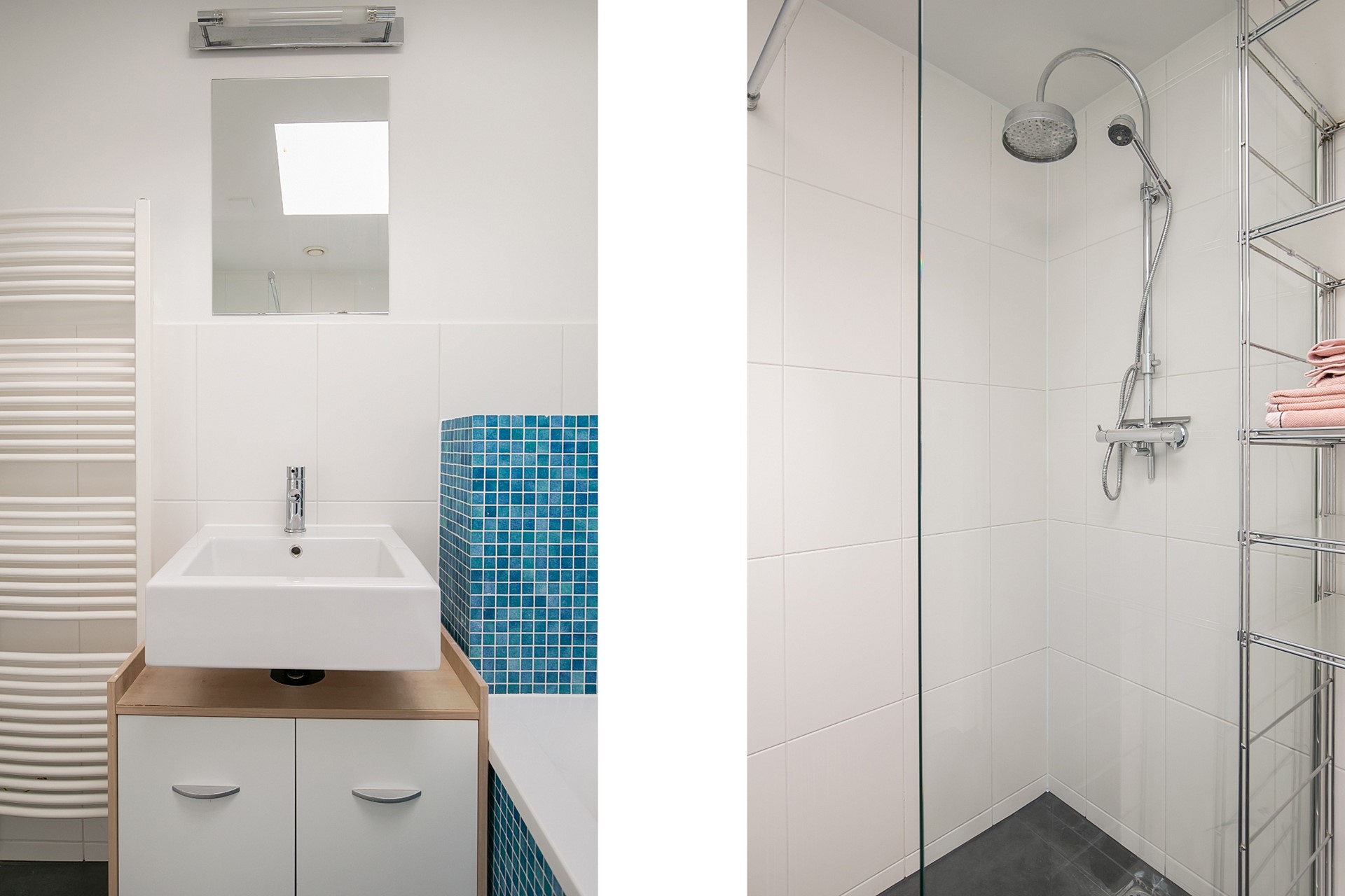 The bathroom has a walk-in shower, toilet, washbasin and a large skylight.