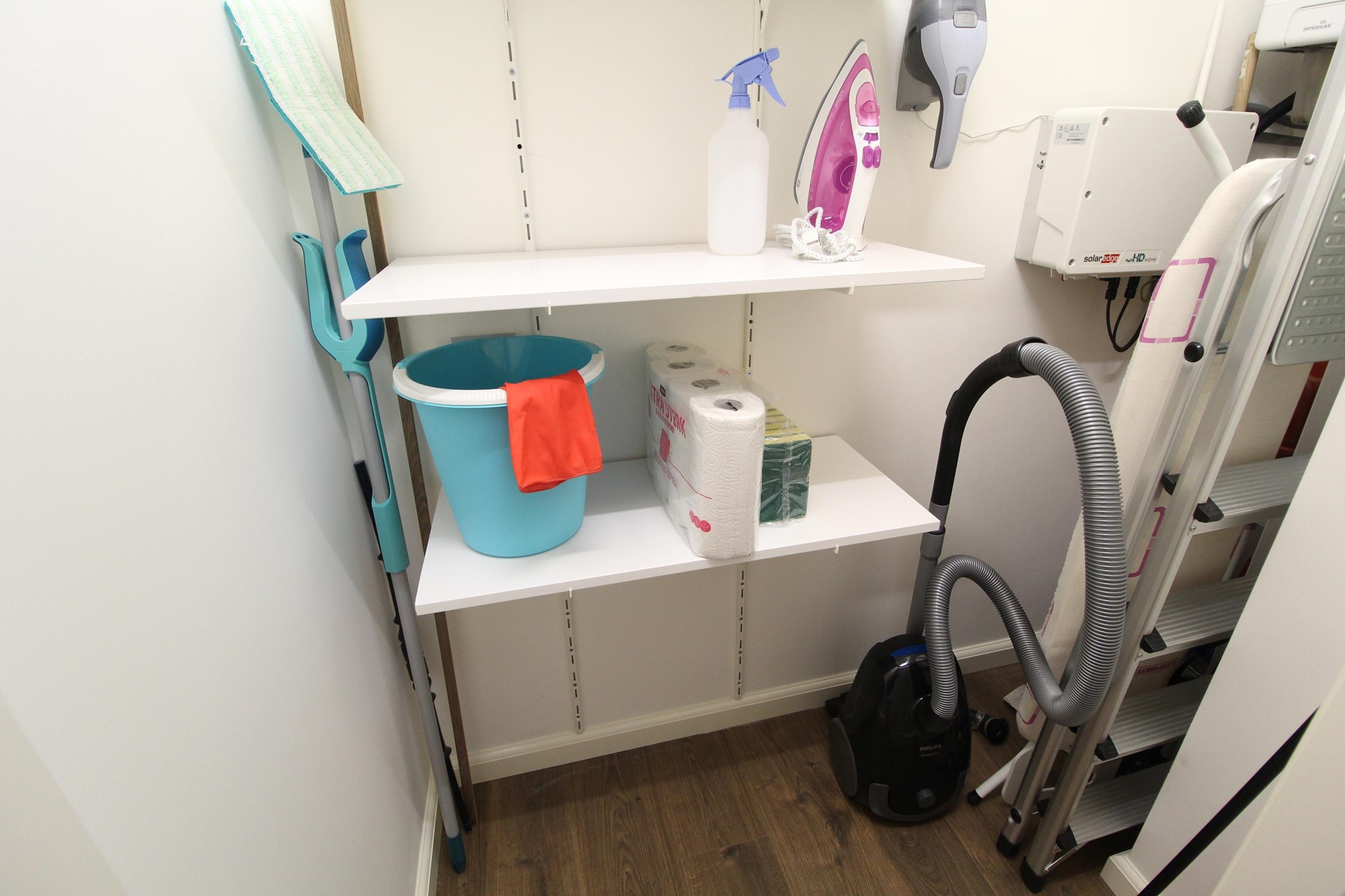 Indoor storage space with central heating system and separate toilet room with washbasin.