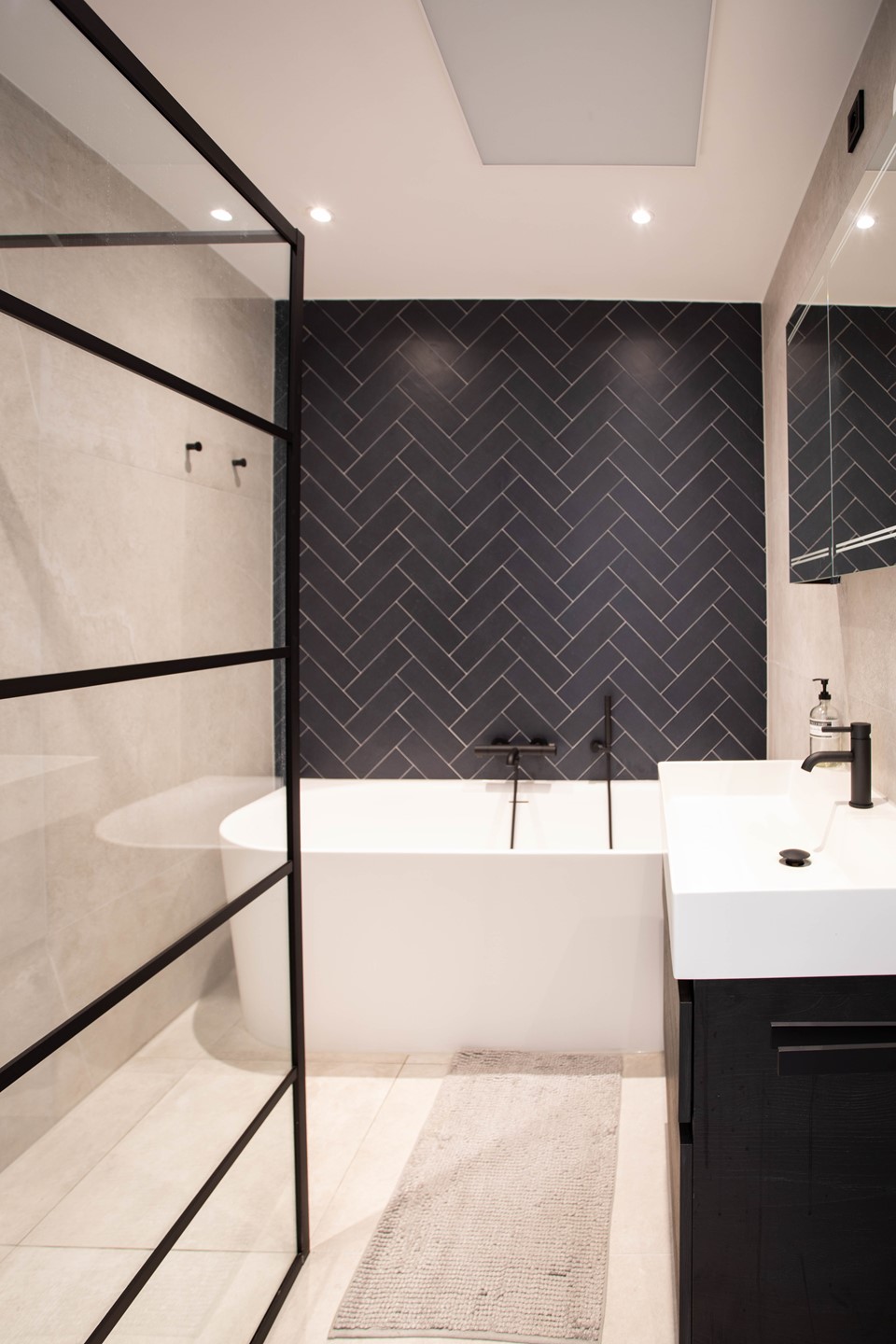 Een interne trap leidt naar de tweede verdieping van het appartement. Hier bevinden zich twee ruime slaapkamers en een derde kamer die geschikt is als werkkamer of thuiswerkplek. De badkamer heeft zowel een douche als een ligbad, een designradiator en een wastafel met meubel.