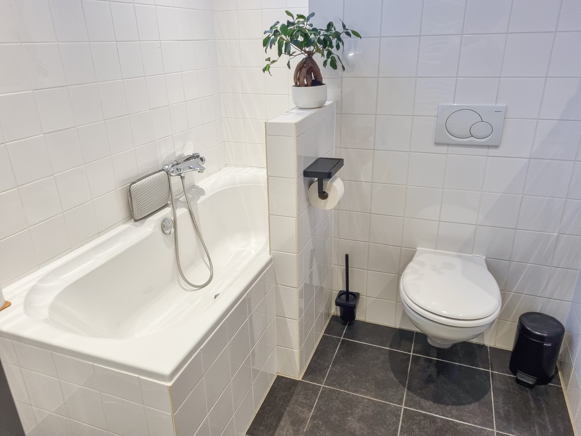 The apartment features two spacious double bedrooms, both with ample built-in storage, making it ideal for a couple or professional sharers. The modern bathroom is fitted with both a bathtub and a separate shower, and the apartment benefits from two toilets, adding extra comfort. A generous entrance hall provides additional storage space for coats and shoes.