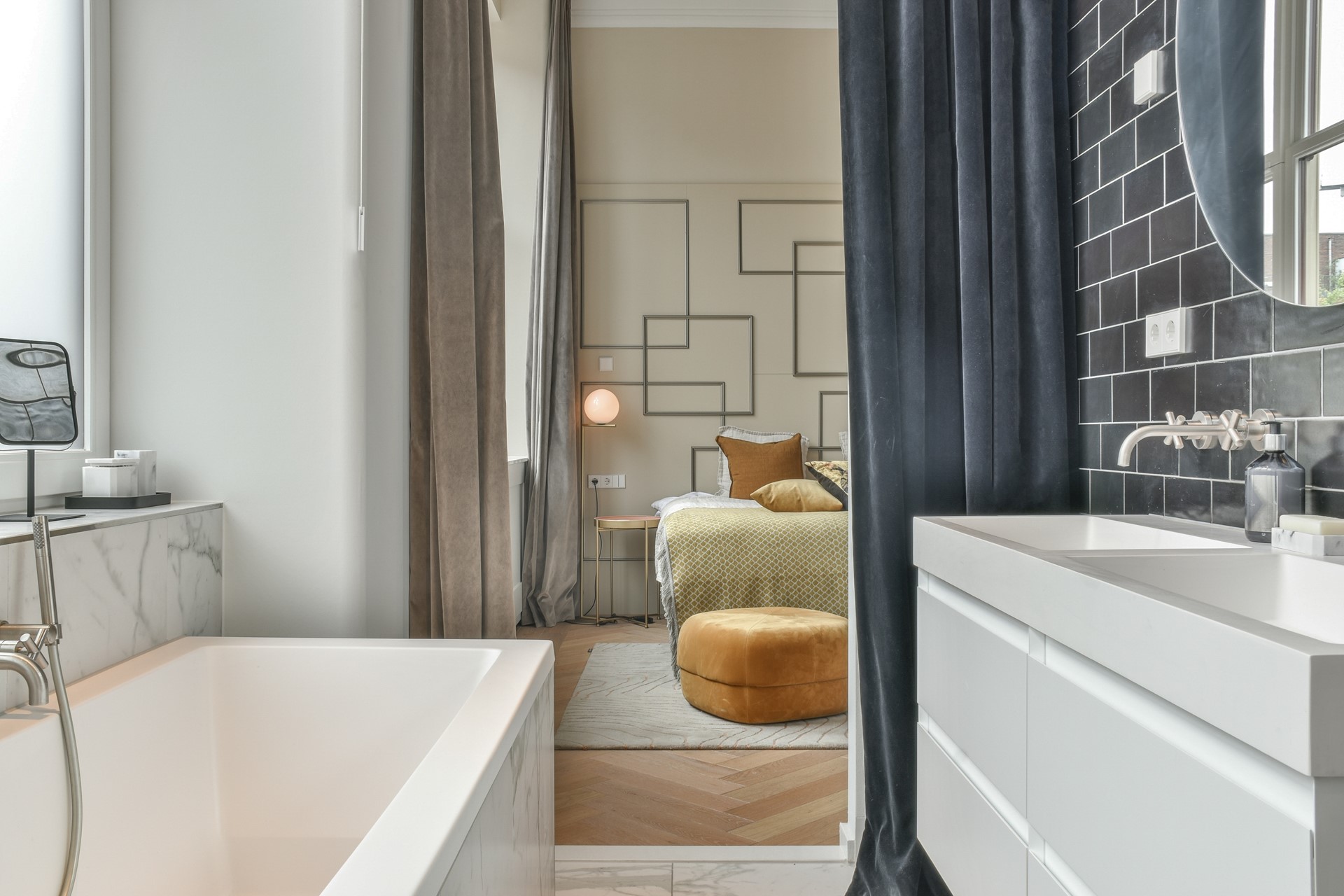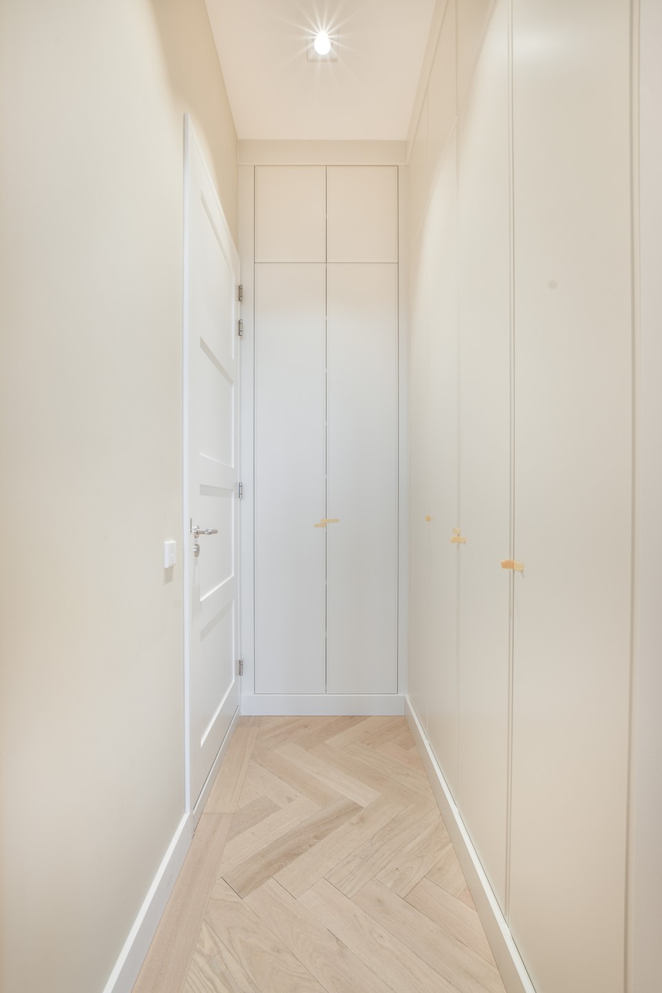 Through the secure entrance on the ground floor, the apartment can be reached by elevator or stairs on the first floor. The elevator opens directly into the apartment. Through the hall you enter the fantastic living room. With high ceilings, old details and a beautiful oak herringbone floor, it is lovely to stay here. The custom made open kitchen is fully equipped. The loggia is a wonderful place, both in summer and winter. The apartment has three bedrooms, two bathrooms and a separate toilet. The apartment is equipped with custom-made built-in closets. The entire apartment has underfloor heating.