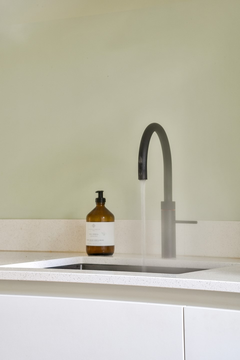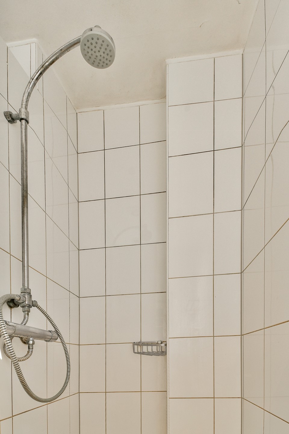 De badkamer is voorzien van een toilet, inloopdouche en wastafel. Hier zijn ook een wasmachine en droger geplaatst.