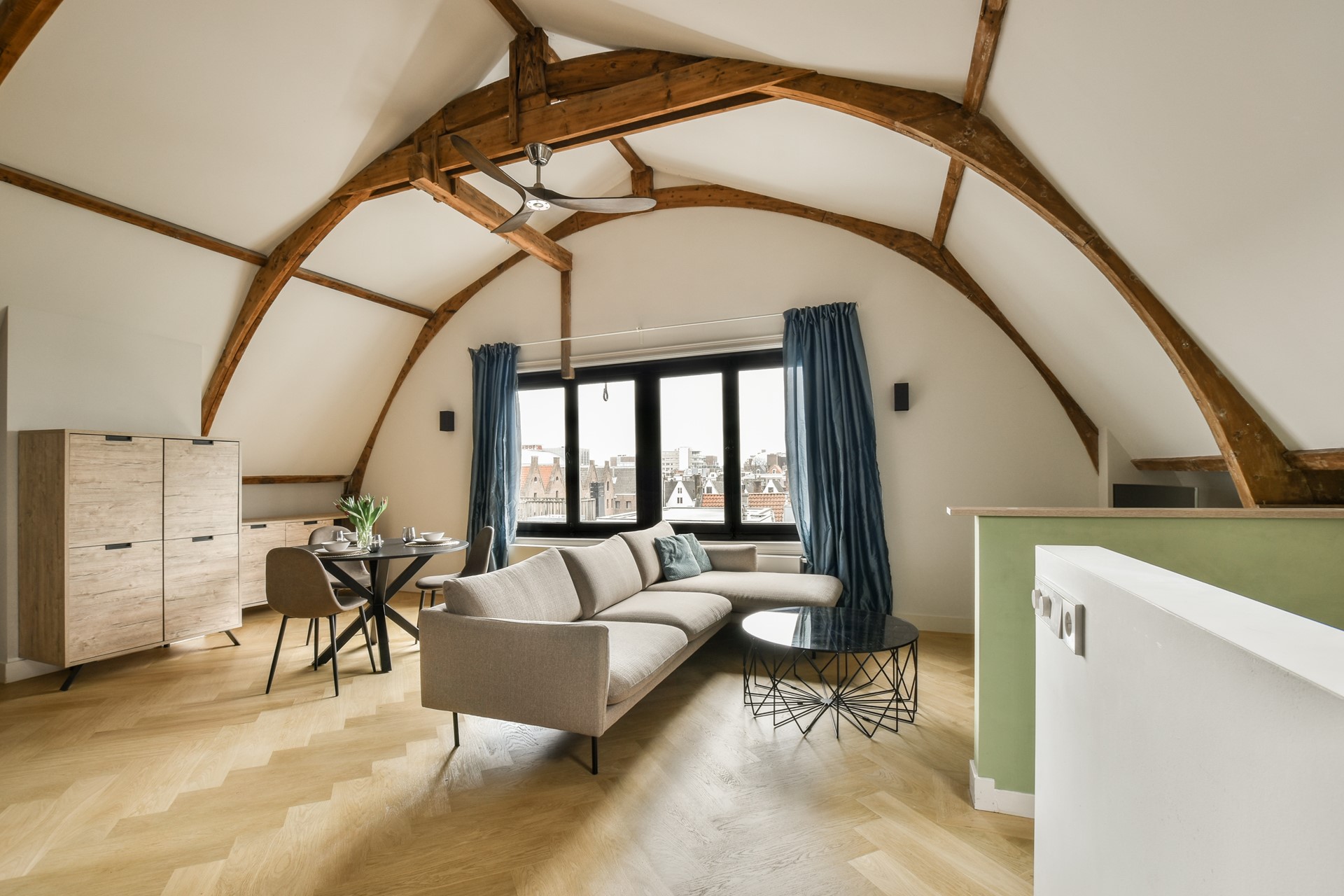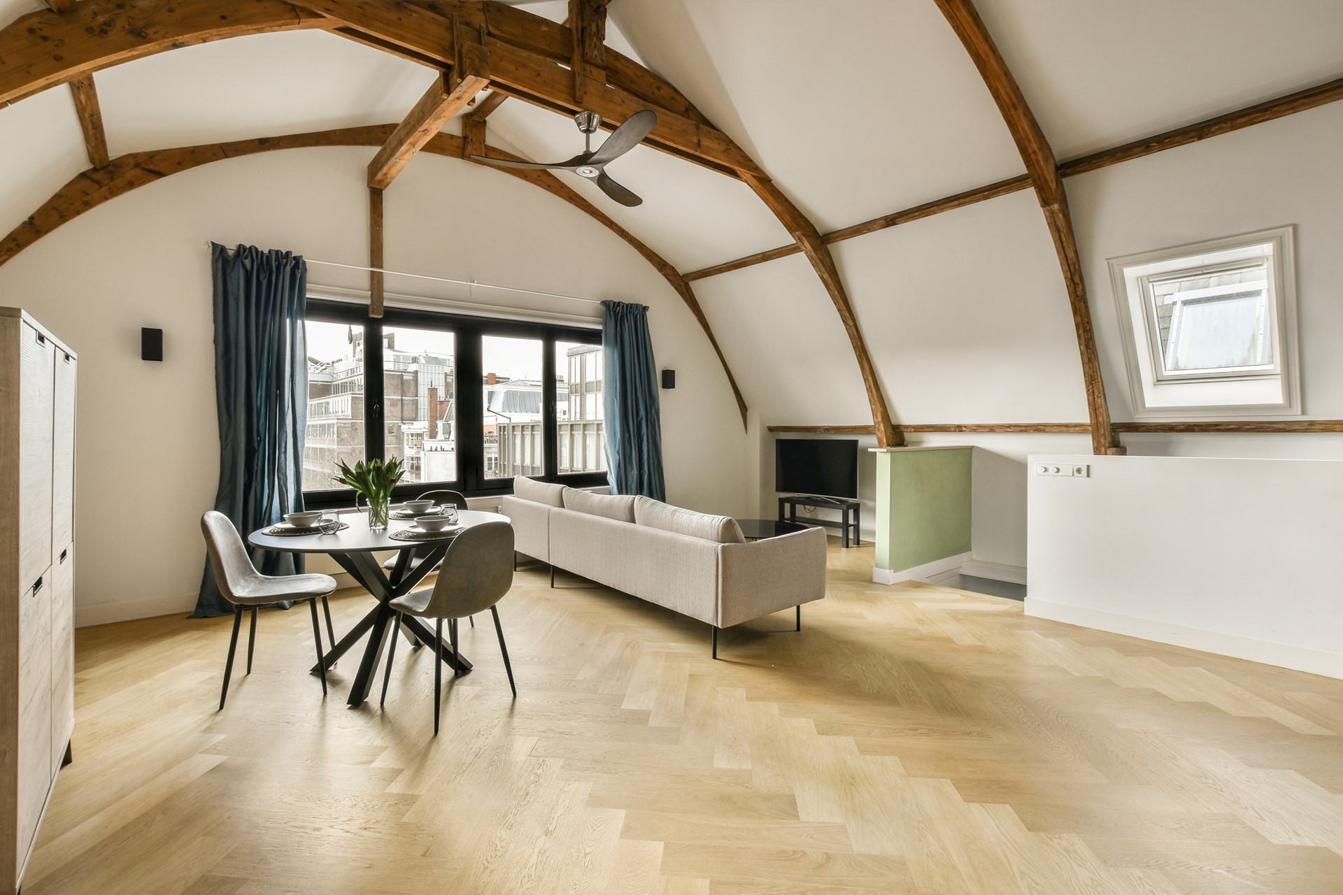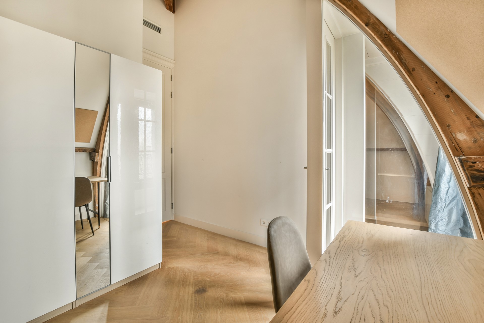 Via de gemeenschappelijke entree bereikt men de eigen ingang van het appartement op de derde verdieping. De interne trap leidt naar de woonkamer met hoog plafond met zicht op de spanten kapconstructie. De open keuken is voorzien van PITT cooking (5 pits), afzuigkap, oven, vaatwasser, koffieautomaat en koel-/vrieskast.