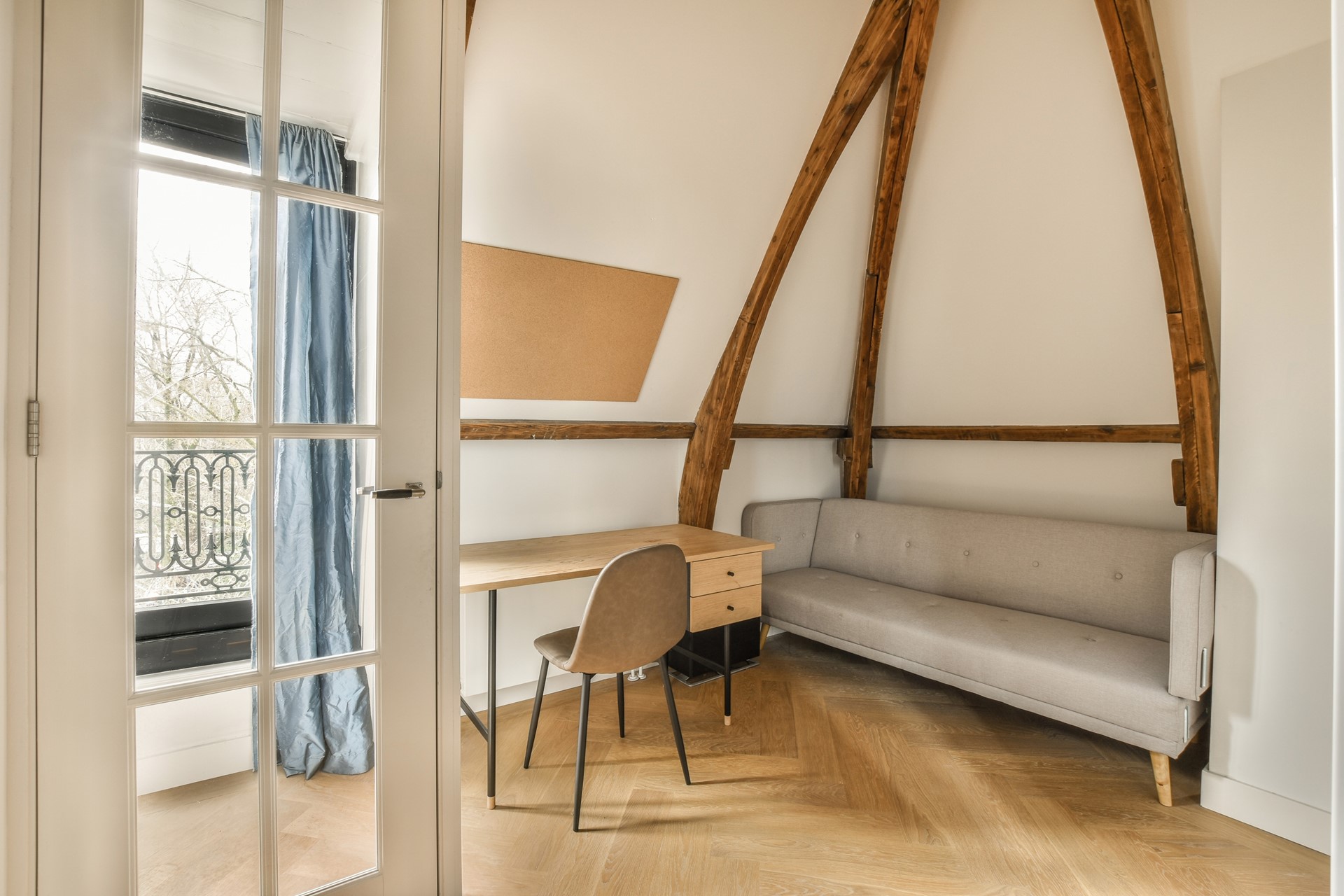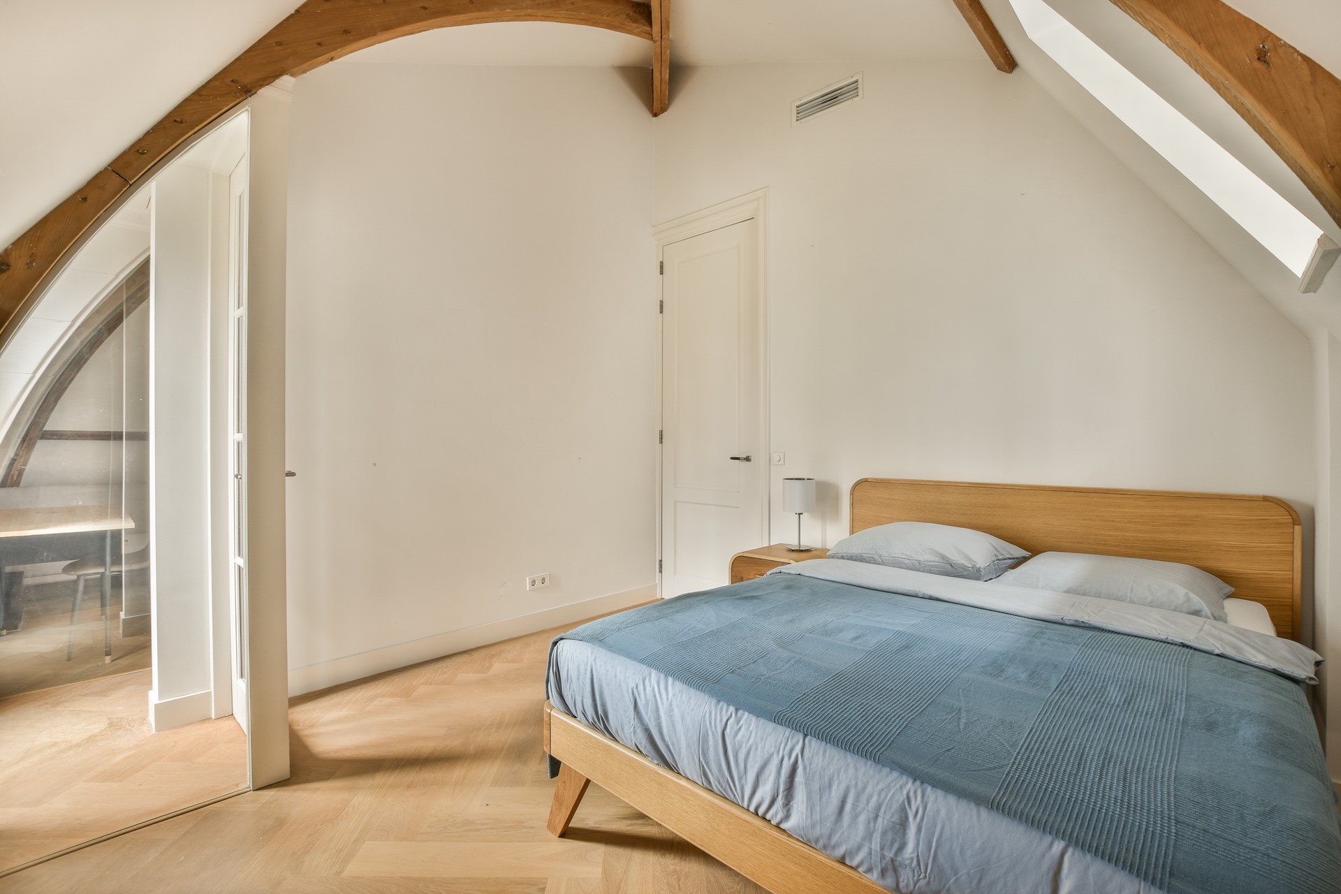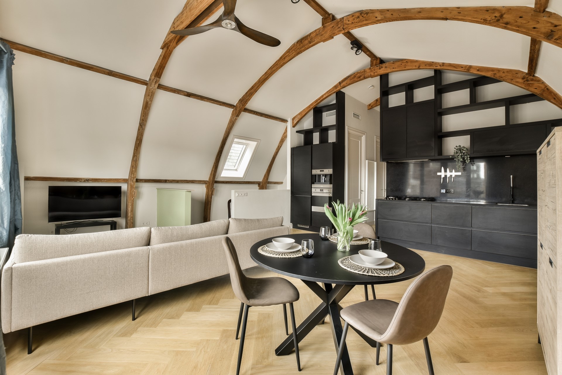 Via the shared entrance, you access the private entrance to the apartment on the third floor. The internal staircase leads to the living room, which features high ceilings and a view of the truss roof construction. The open kitchen is equipped with PITT cooking (5 burners), an extractor hood, an oven, a dishwasher, a coffee machine, and a fridge/freezer.