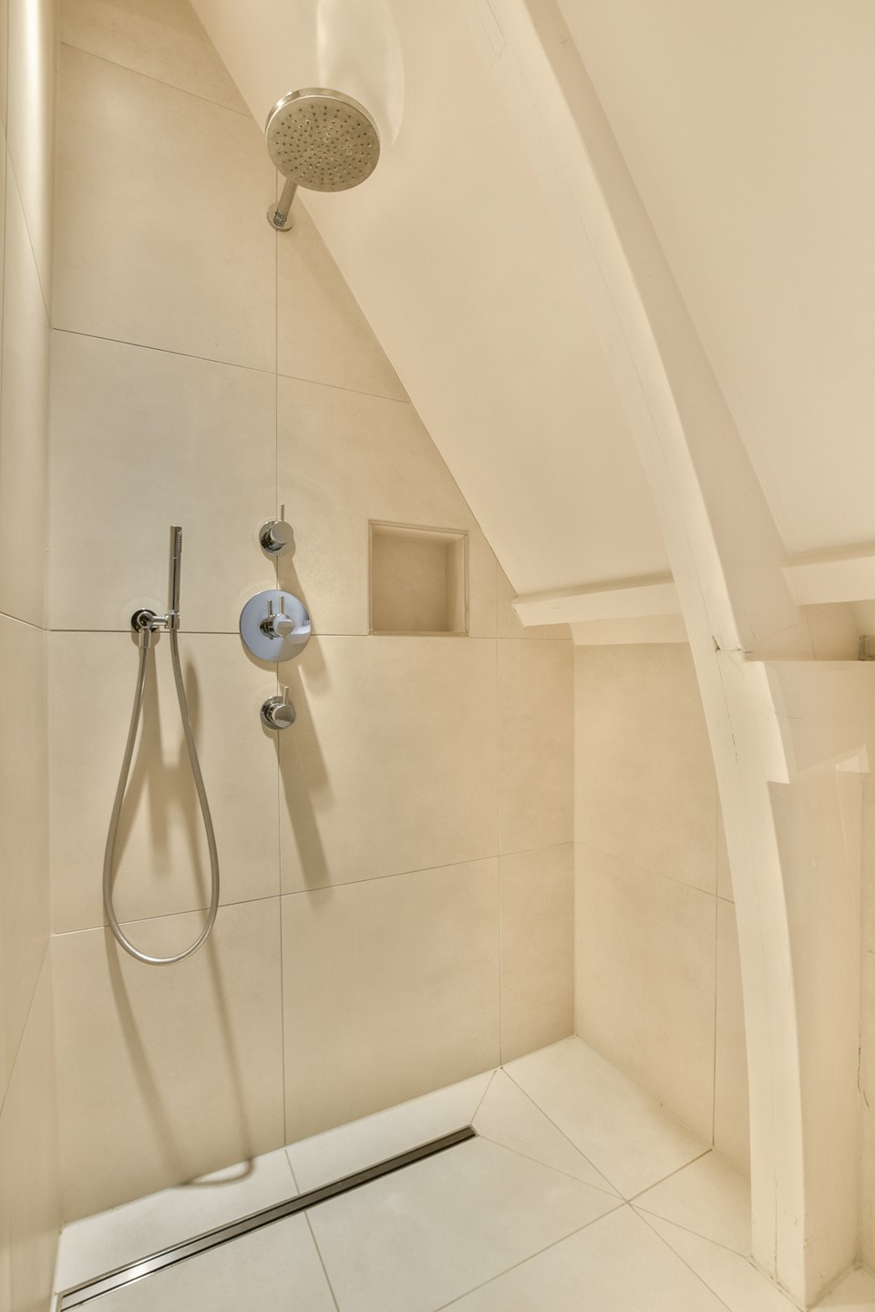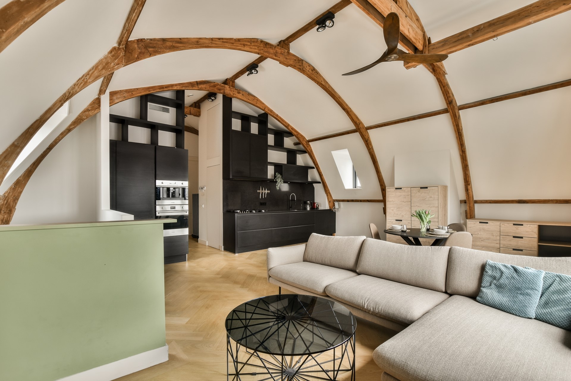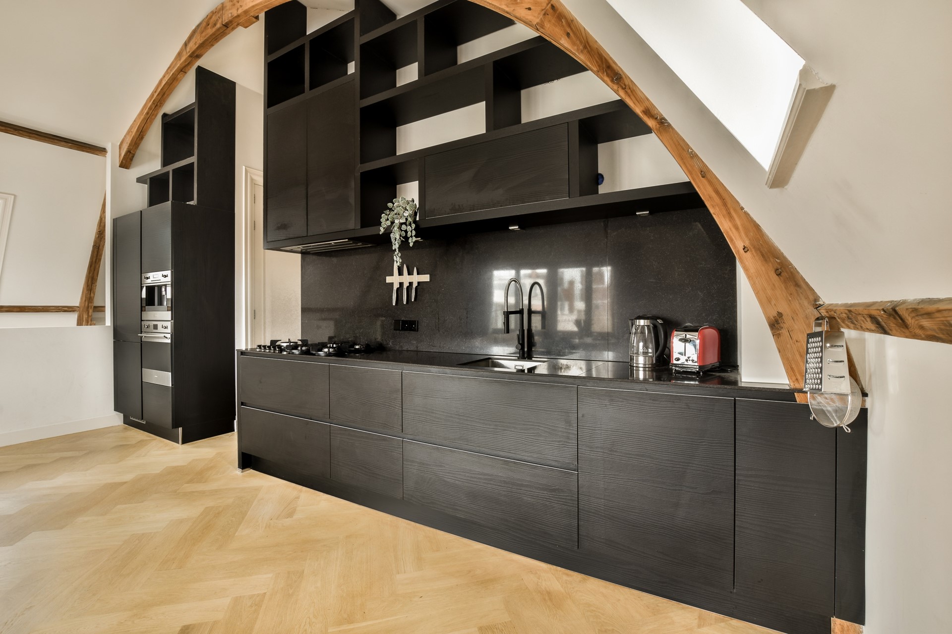 Via the shared entrance, you access the private entrance to the apartment on the third floor. The internal staircase leads to the living room, which features high ceilings and a view of the truss roof construction. The open kitchen is equipped with PITT cooking (5 burners), an extractor hood, an oven, a dishwasher, a coffee machine, and a fridge/freezer.