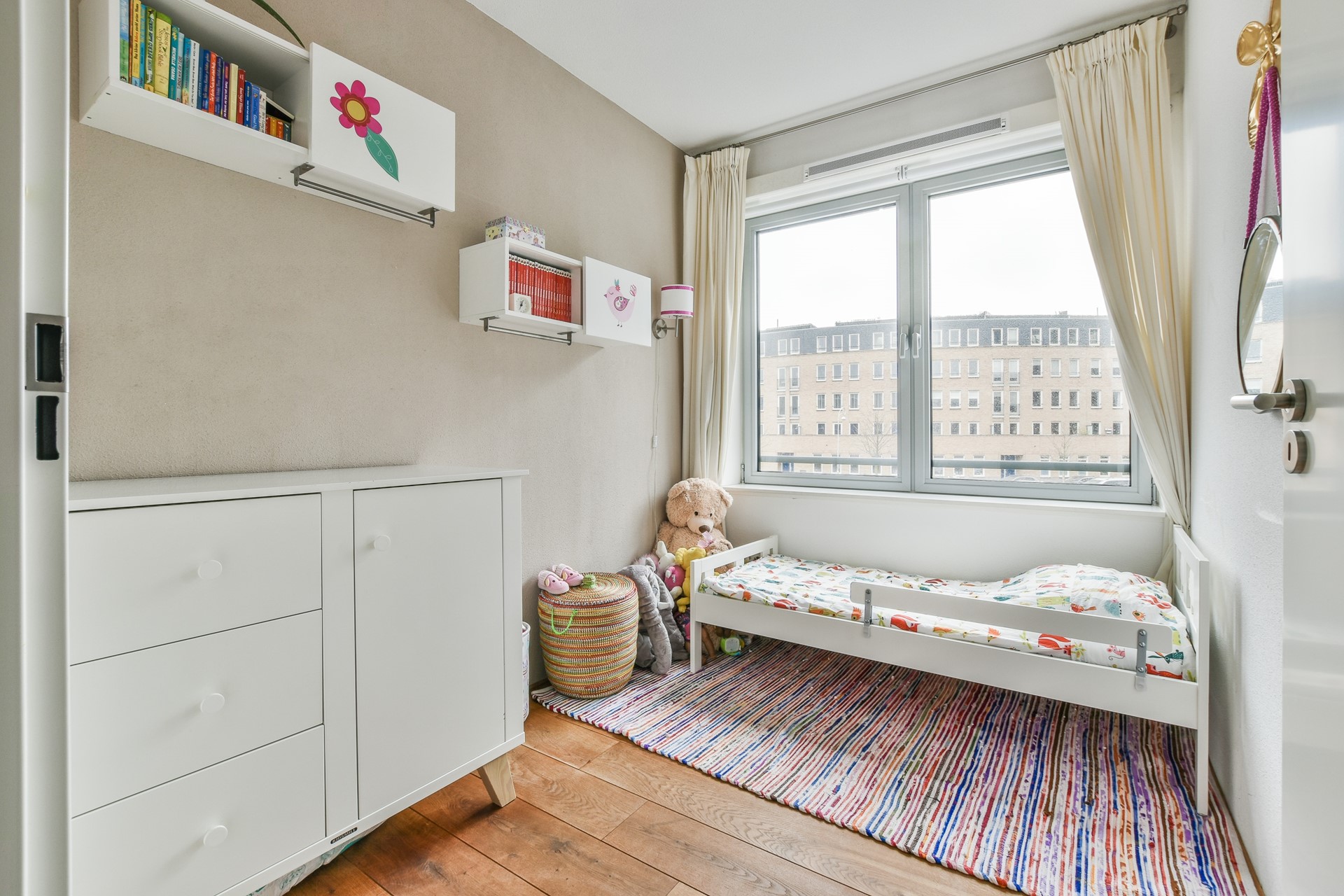 At the rear of the apartment is the living room with an open kitchen overlooking the Kostverlorenvaart. The balcony can also be accessed from the living room. The kitchen is equipped with a refrigerator, dishwasher, oven-microwave combination, and gas stove.
