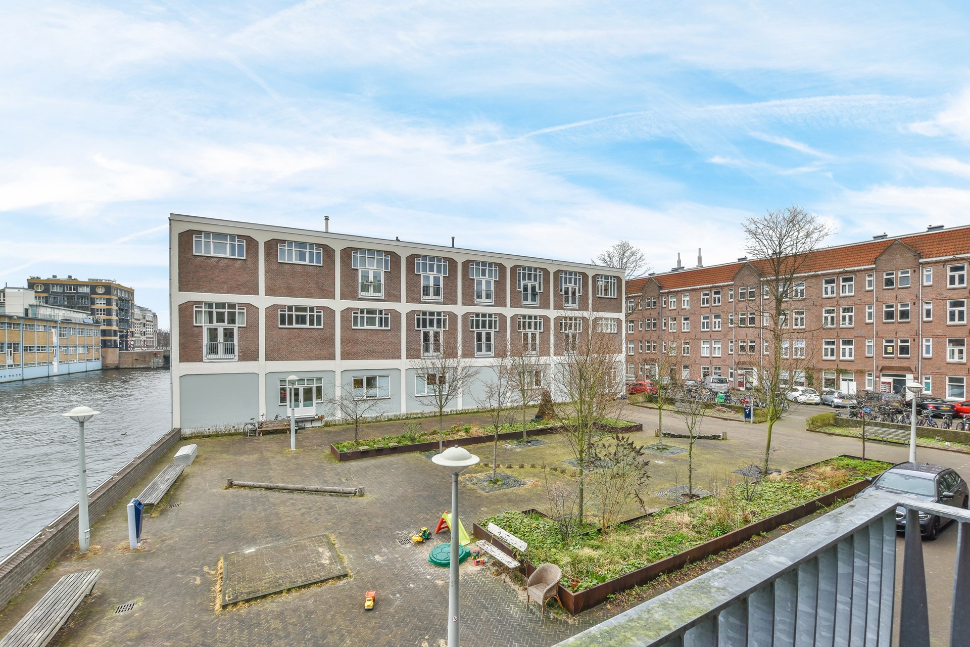 Aan de achterzijde van de woning bevindt zich de woonkamer met open keuken met uitzicht op de Kostverlorenvaart. Via de woonkamer is er tevens toegang tot het balkon. De keuken is voorzien van een ijskast, afwasmachine, oven-magnetroncombinatie en een gaskookplaat.