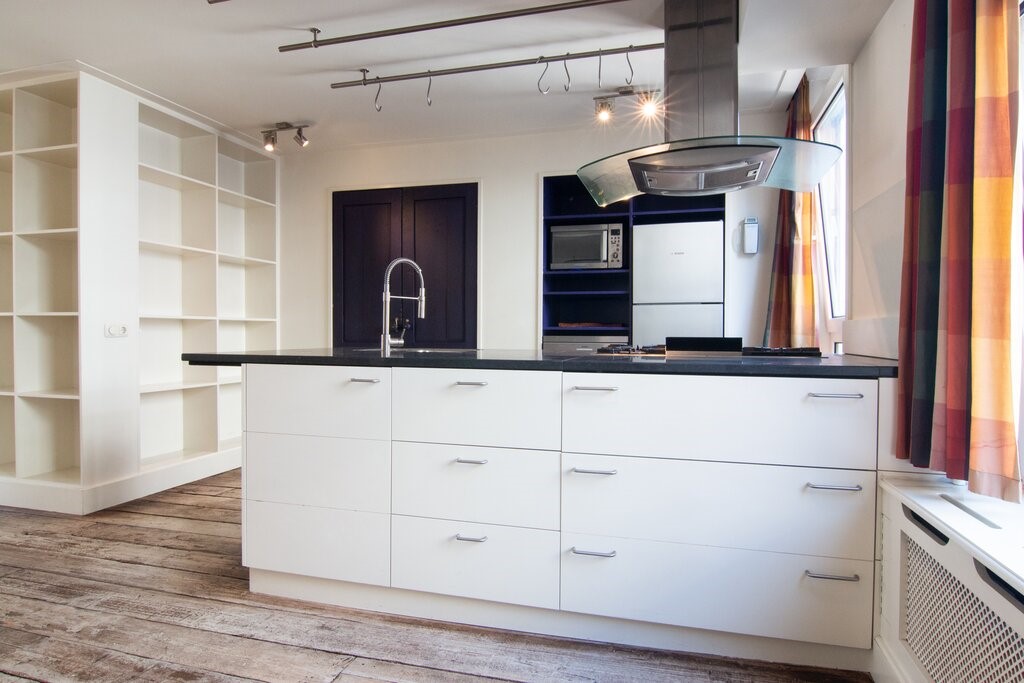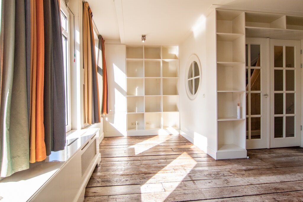 There is an open kitchen with cooking island, supplied with Borretti oven, stove & teppanyaki plate, dishwasher, fridge, freezer, microwave and lots of storage space. L-shaped living from front to back, very light and with nicely designed built-in cupboard space. On the 3d floor 2 bedrooms, a modern bathroom and on top the roof terrace!
