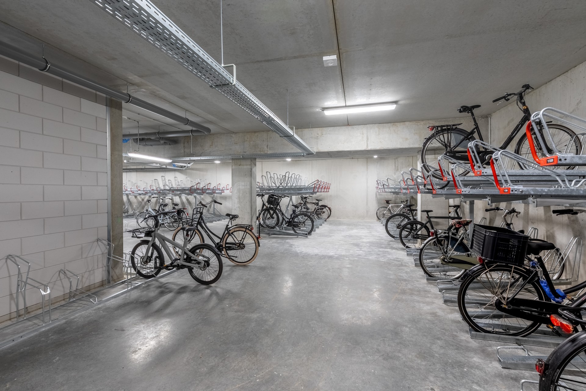 One enters the apartment in a small hallway that connects to all the rooms. There is a storage room, a separate toilet, a bathroom, 2 bedrooms and a living room with open plan kitchen. The storage room can be used as washroom (it has connections) as well as pantry, or even both. There is a separate additional storage in the basement of the building as well as a large communal bike parking..