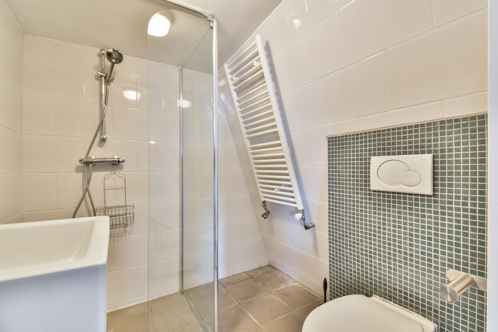 Entrance on third floor, bright living room with open-plan kitchen fully equipped with all appliances, separate toilet and balcony in the back. Extra storage room/pantry available.