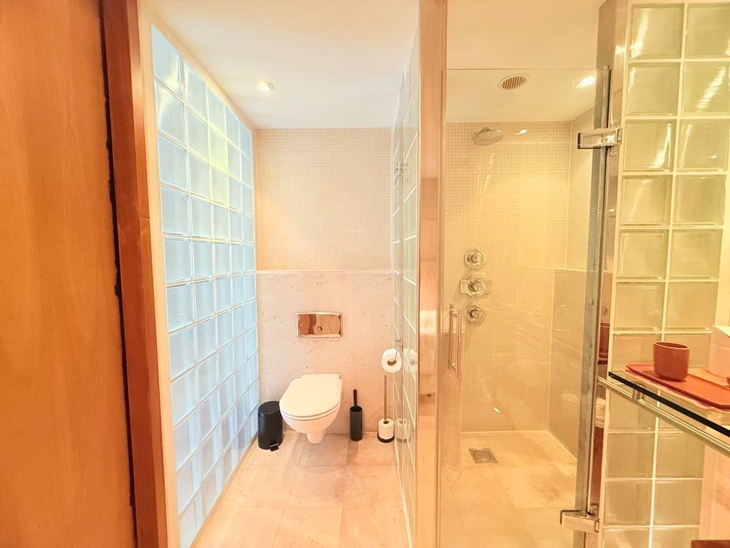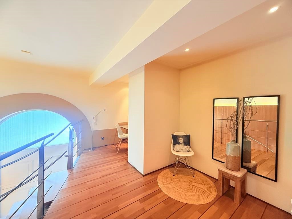 The large landing on the second floor gives access to a workspace. The two bedrooms are at the back; one spacious bedroom and a master bedroom with adjoining bathroom featuring a bath, vanity, toilet, and walk-in massage shower. The apartment is beautifully finished with French limestone flooring, lovely wooden floors, and luxurious bathrooms and kitchen.
