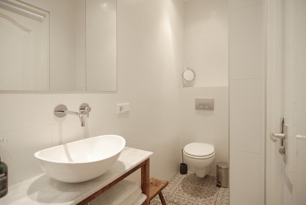 Communal entrance, stairs to second floor, wardrobe area, bright en-suite living including built in storage space, home office/room at the front with wardrobe and washing machine, modern bathroom with charming Portugese tiles, shower, sink and toilet, open kitchen equipped with island, large gas stove including proper oven, fridge, freezer and dishwasher, cosy bedroom at the quiet rear with steel frame door and stylish brick wall.